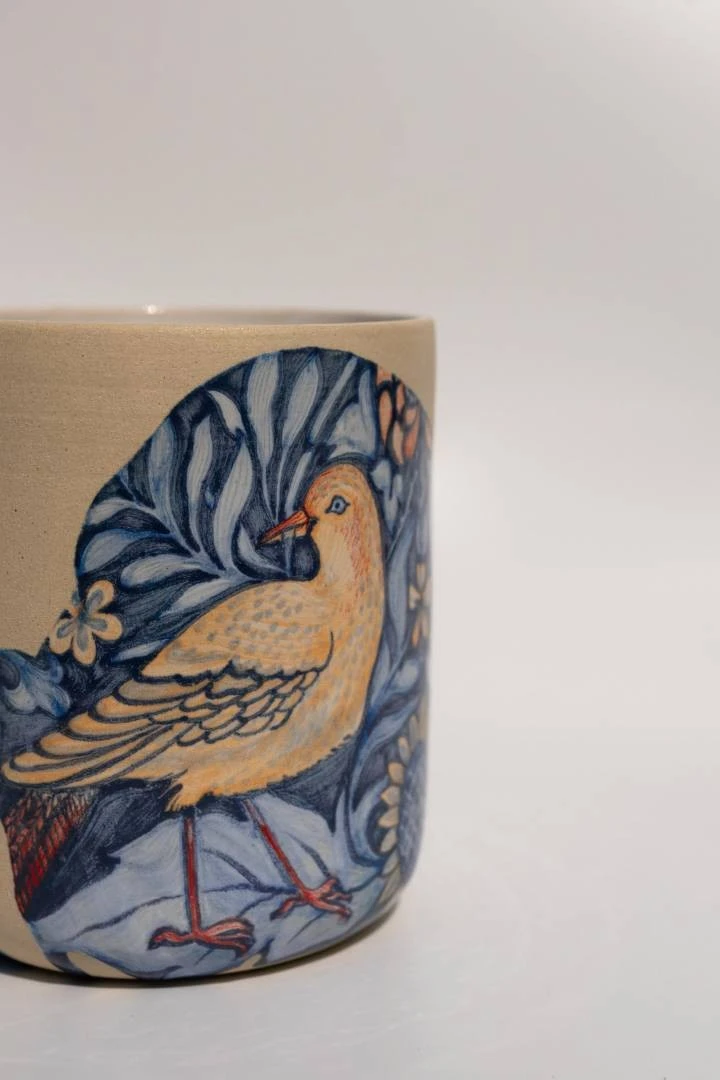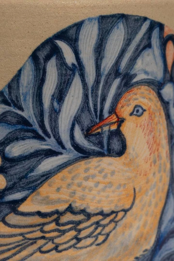 Мои работы не полностью покрыты керамической глазурью. Эта идея пришла мне в голову, когда в очередной раз в музее я смотрела на древние керамические сосуды и увидела нечто привлекательное в том, что утраченная часть сосуда восстановлена реставраторами, но она совершенно пуста. Что же изобразил в этом месте художник той эпохи? Это загадка. А я люблю загадки и решила воспроизвести этот прием в своих работах. Я заливаю изделия глазурью лишь частично, и зачастую глазурь рисует свой рисунок и определяет, что будет утрачено, а что нет. После того, как я покрыла изделие глазурью, я убираю лишние пятна, которые выглядят не очень живо. После этого уже наношу сюжет с помощью подглазурных красок и пигментов.