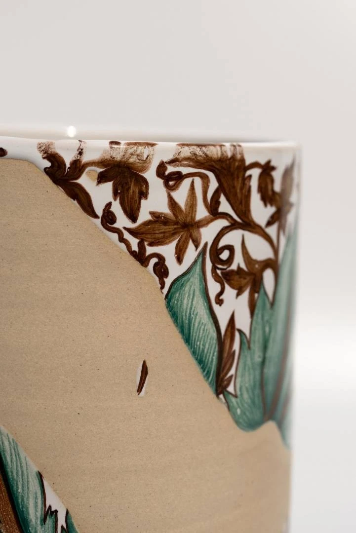 Мои работы не полностью покрыты керамической глазурью. Эта идея пришла мне в голову, когда в очередной раз в музее я смотрела на древние керамические сосуды и увидела нечто привлекательное в том, что утраченная часть сосуда восстановлена реставраторами, но она совершенно пуста. Что же изобразил в этом месте художник той эпохи? Это загадка. А я люблю загадки и решила воспроизвести этот прием в своих работах. Я заливаю изделия глазурью лишь частично, и зачастую глазурь рисует свой рисунок и определяет, что будет утрачено, а что нет. После того, как я покрыла изделие глазурью, я убираю лишние пятна, которые выглядят не очень живо. После этого уже наношу сюжет с помощью подглазурных красок и пигментов.