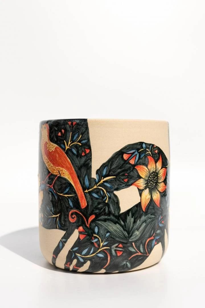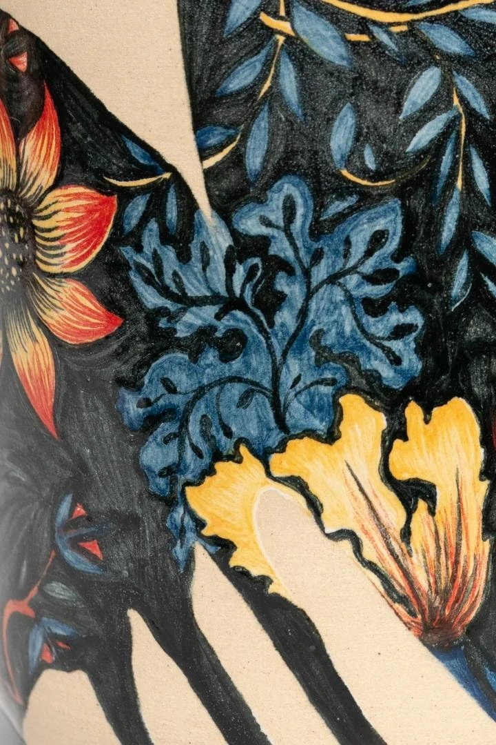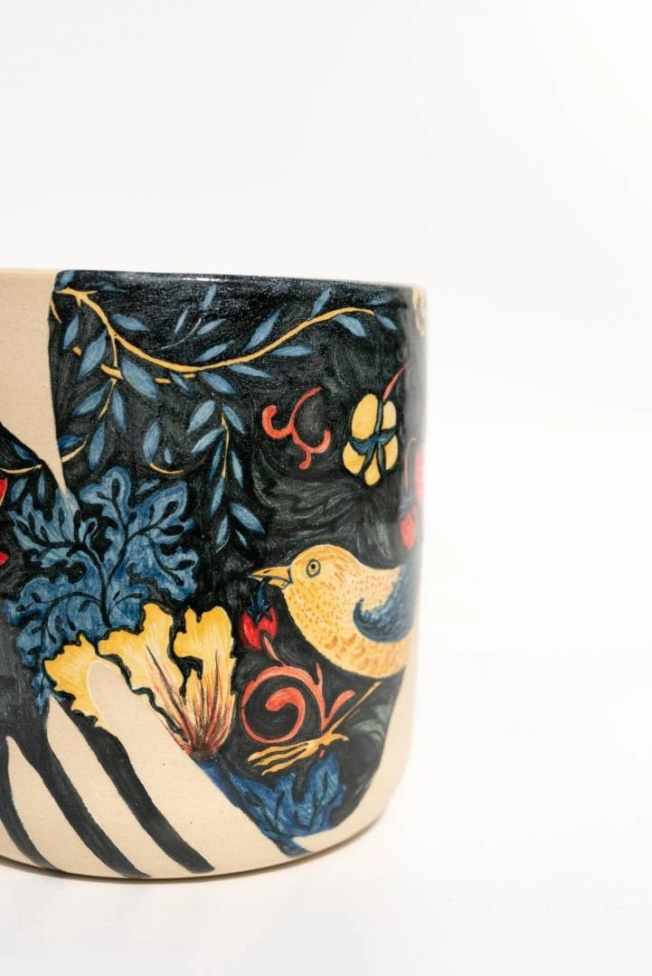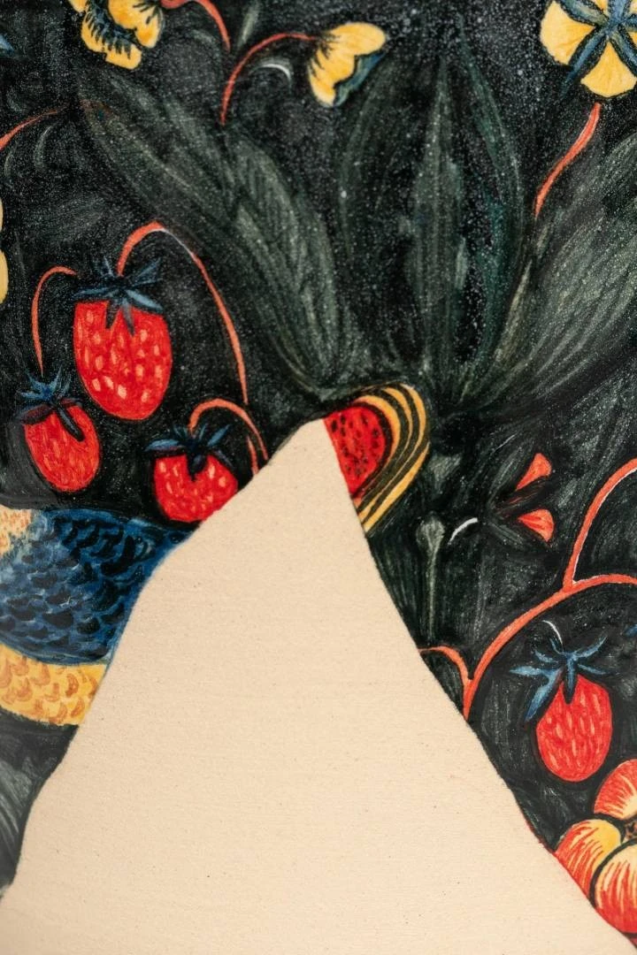 Мои работы не полностью покрыты керамической глазурью. Эта идея пришла мне в голову, когда в очередной раз в музее я смотрела на древние керамические сосуды и увидела нечто привлекательное в том, что утраченная часть сосуда восстановлена реставраторами, но она совершенно пуста. Что же изобразил в этом месте художник той эпохи? Это загадка. А я люблю загадки и решила воспроизвести этот прием в своих работах. Я заливаю изделия глазурью лишь частично, и зачастую глазурь рисует свой рисунок и определяет, что будет утрачено, а что нет. После того, как я покрыла изделие глазурью, я убираю лишние пятна, которые выглядят не очень живо. После этого уже наношу сюжет с помощью подглазурных красок и пигментов.