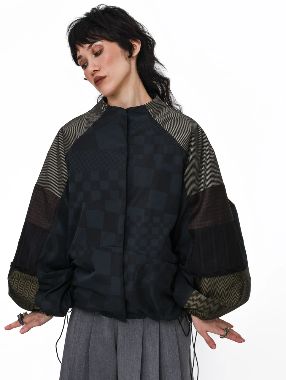 Рукава каждого изделия собраны вручную Катей Козыревой из разных кусочков ткани, как пазл. Повторяющихся нет! Изделие имеет кулиски по низу и на рукавах. Вы можете играть, создавая объемные формы, или носить свободно, не используя кулиску.