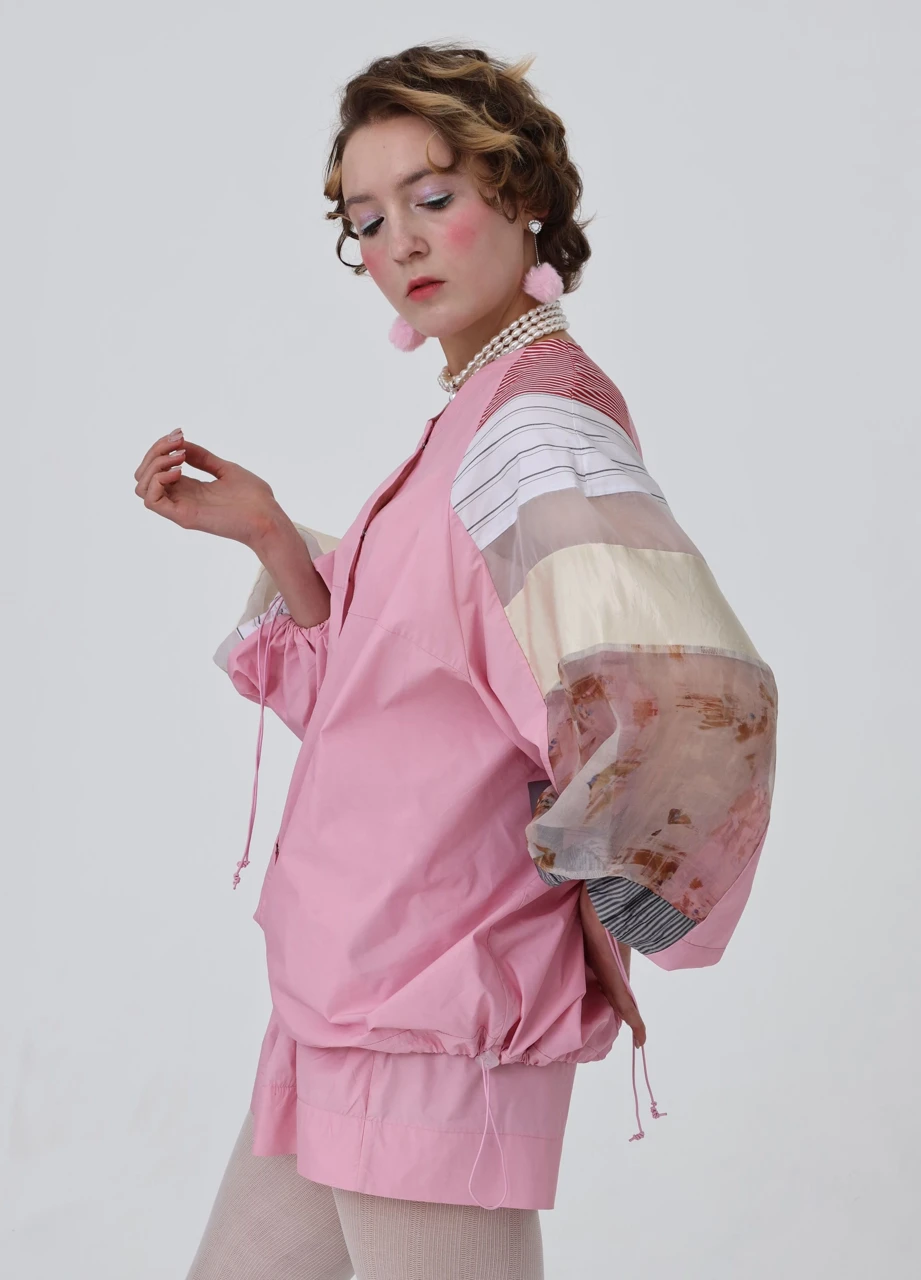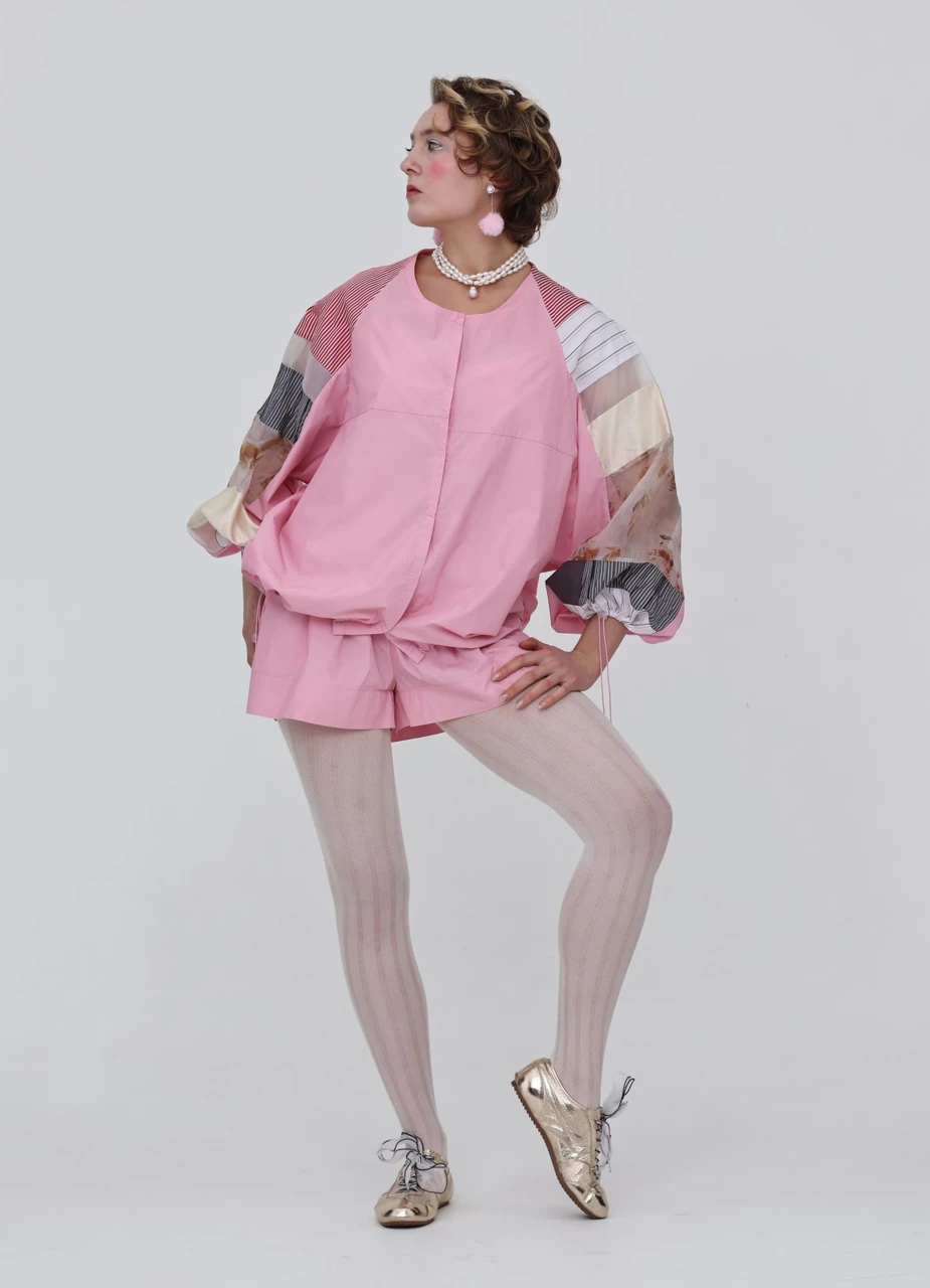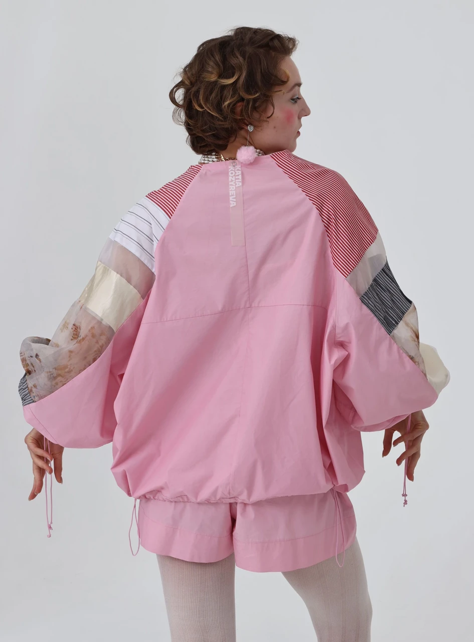 Пазл-бомбер «Щербет» — один из предметов летнего дропа бренда Katia Kozyreva. Всего в серии 17 уникальных накидок-кимоно и два бомбера. Рукава каждого из них собраны вручную Катей Козыревой из разных кусочков ткани, как пазл. Каждый рукав неповторим. Бомбер в единственном экземпляре.