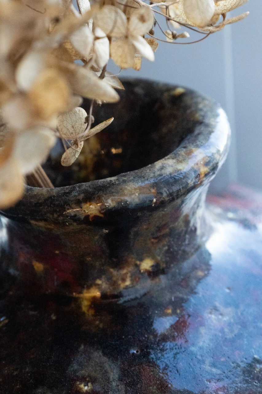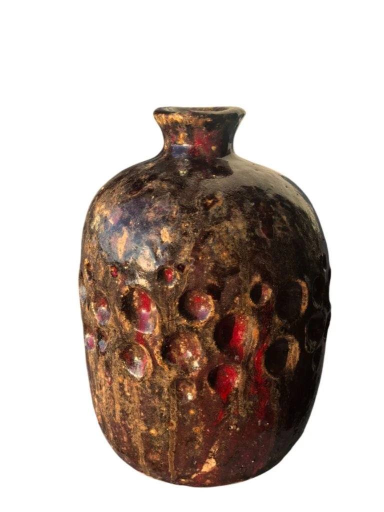 Это авторская керамическая работа, выполненная из белой глины с использованием глазури. Поверхность скульптуры покрыта многослойной глазурью глубоких бордовых, коричневых и черных оттенков, создавая ощущение глубины и таинственности. Рельефная текстура, образованная рядами выпуклых полусфер, придает объекту тактильную выразительность и игру света и тени. Несмотря на абстрактный характер, работа «Бордо» обладает выразительной фактурой и богатой цветовой палитрой. Сочетание матовых и глянцевых участков глазури, а также рельефный узор, делают этот объект интересным для визуального и тактильного восприятия. Авторская работа «Бордо» станет выразительным арт-объектом для интерьера, дополнит коллекцию современного искусства.