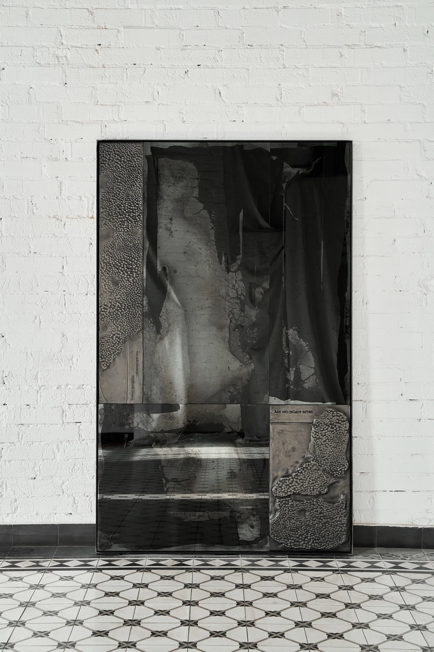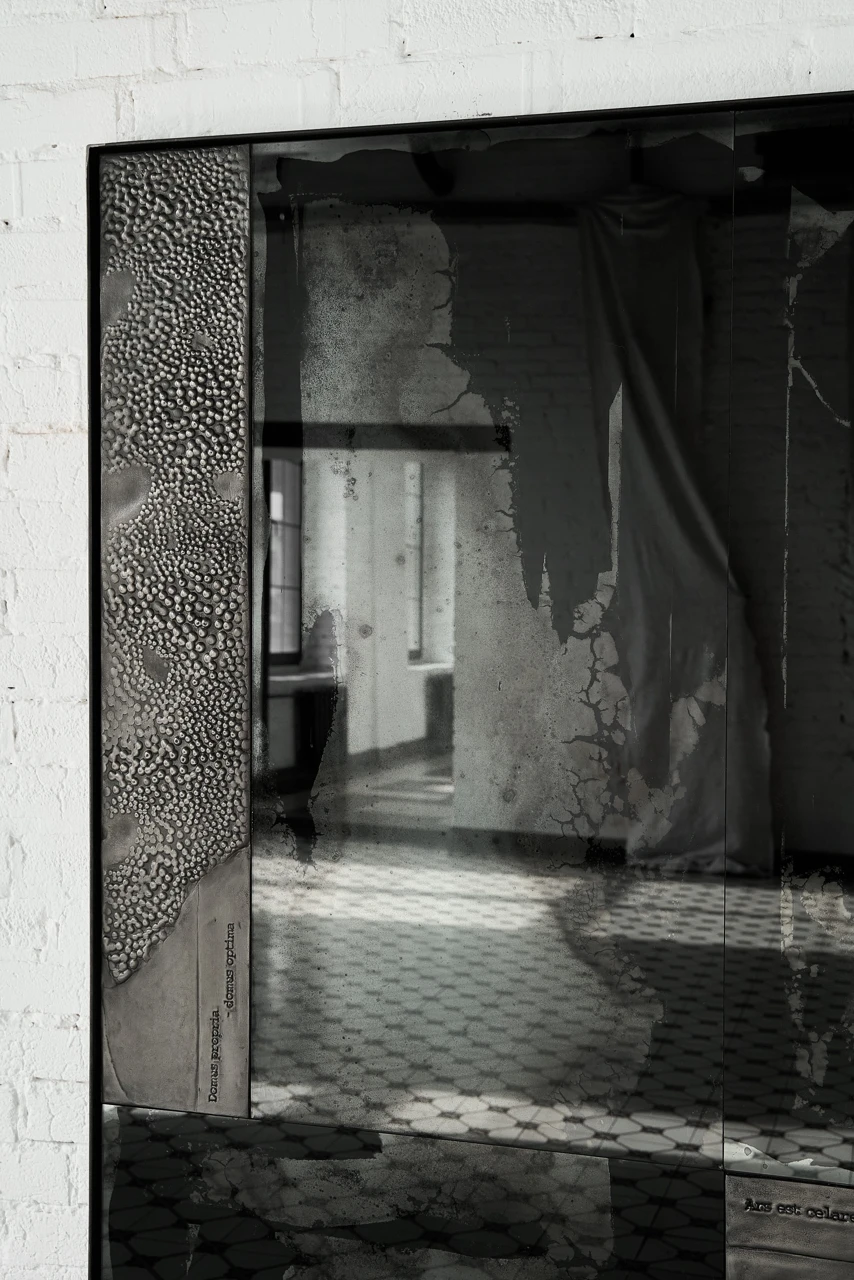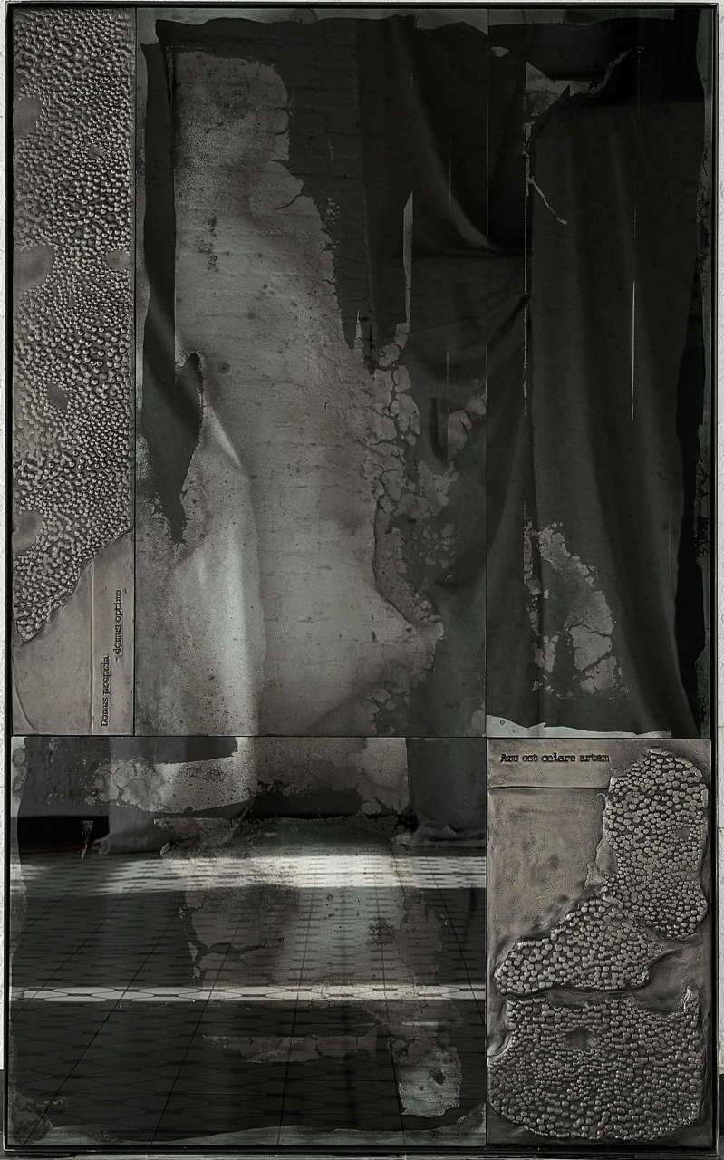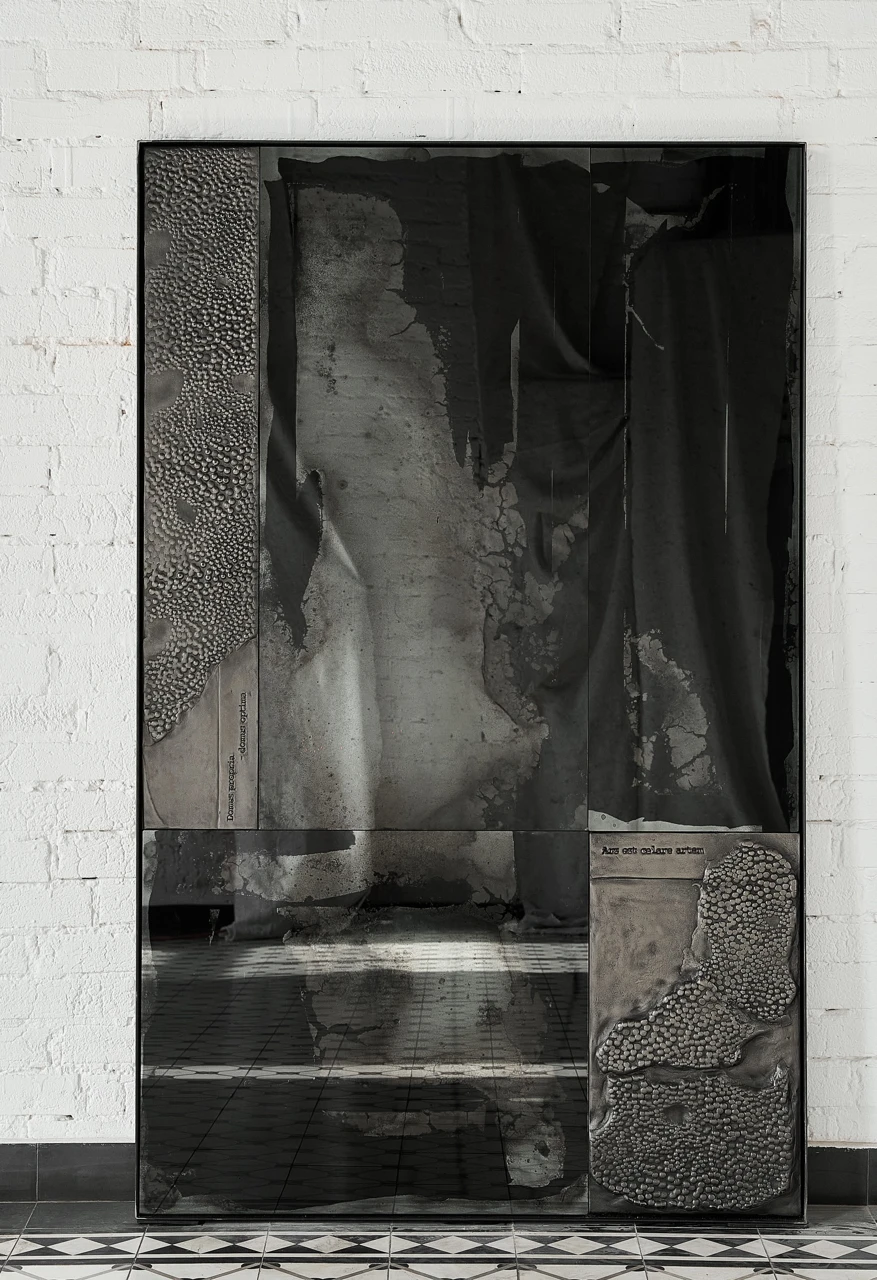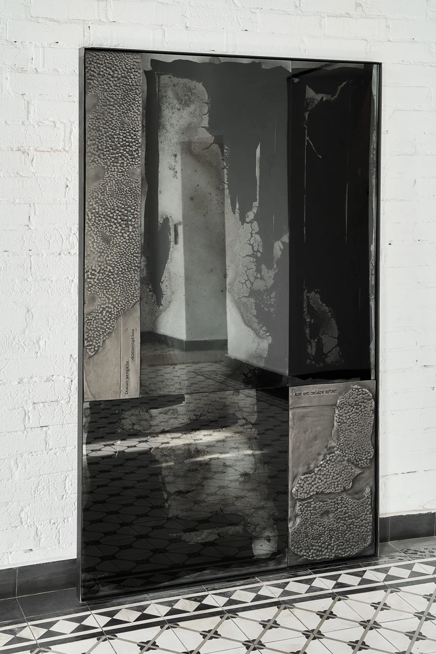 Скульптурная поверхность деталей в никеле и необычные отражения пространства в состаренных по старинной технологии чернения зеркальных поверхностях придают работе многослойность и глубину. Сложная, интересная, загадочная работа, которая несомненно украсит современный интерьер.
