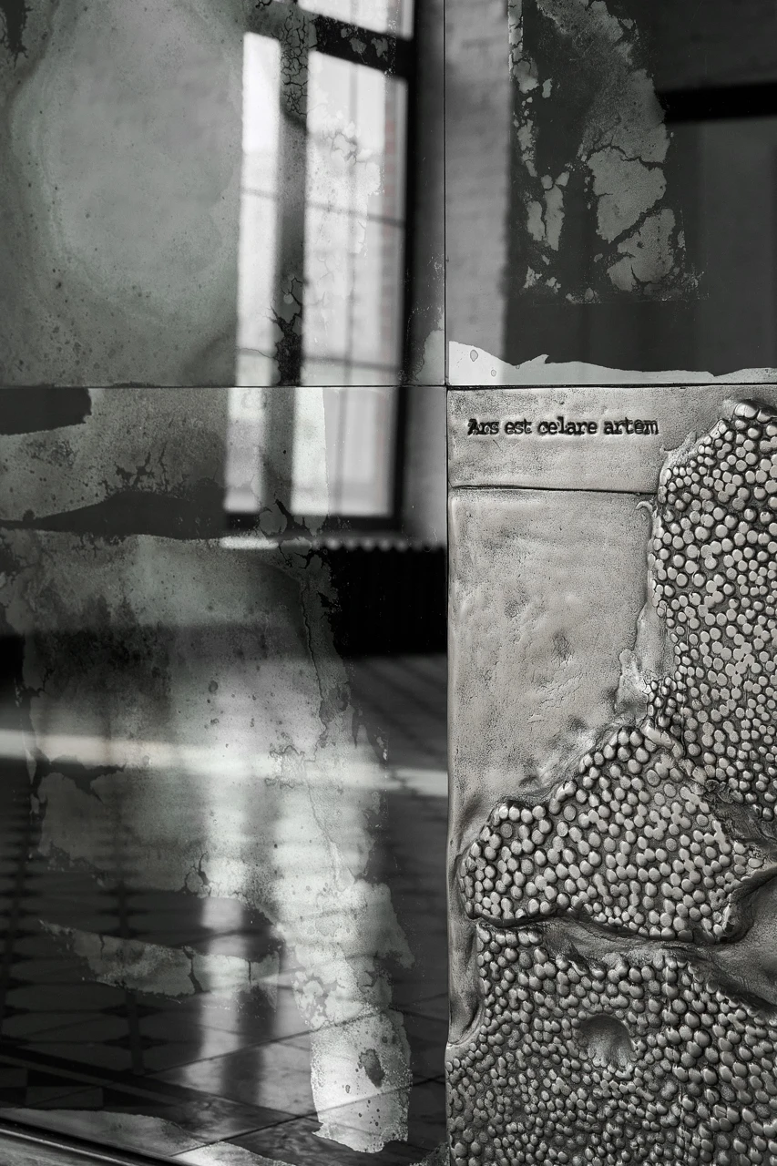 В нижней части панно на никеле нанесена надпись на латыни Ars est celare artem (Искусство — в умении скрыть искусство).