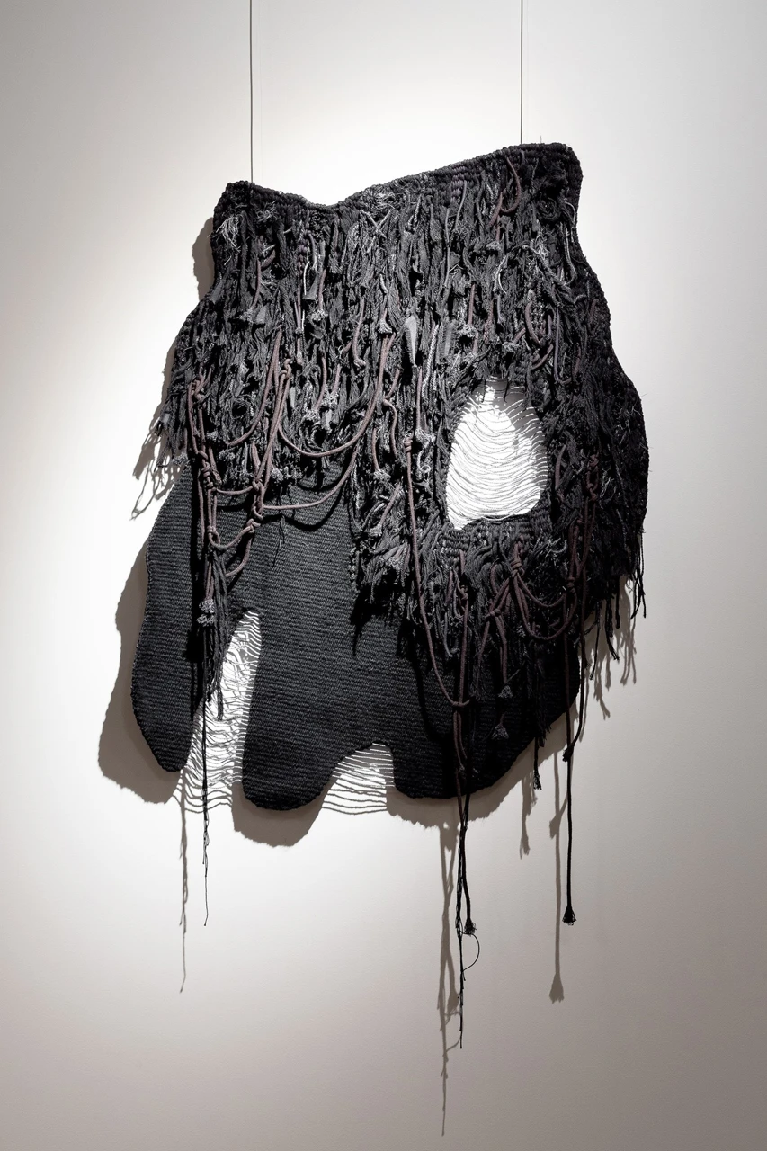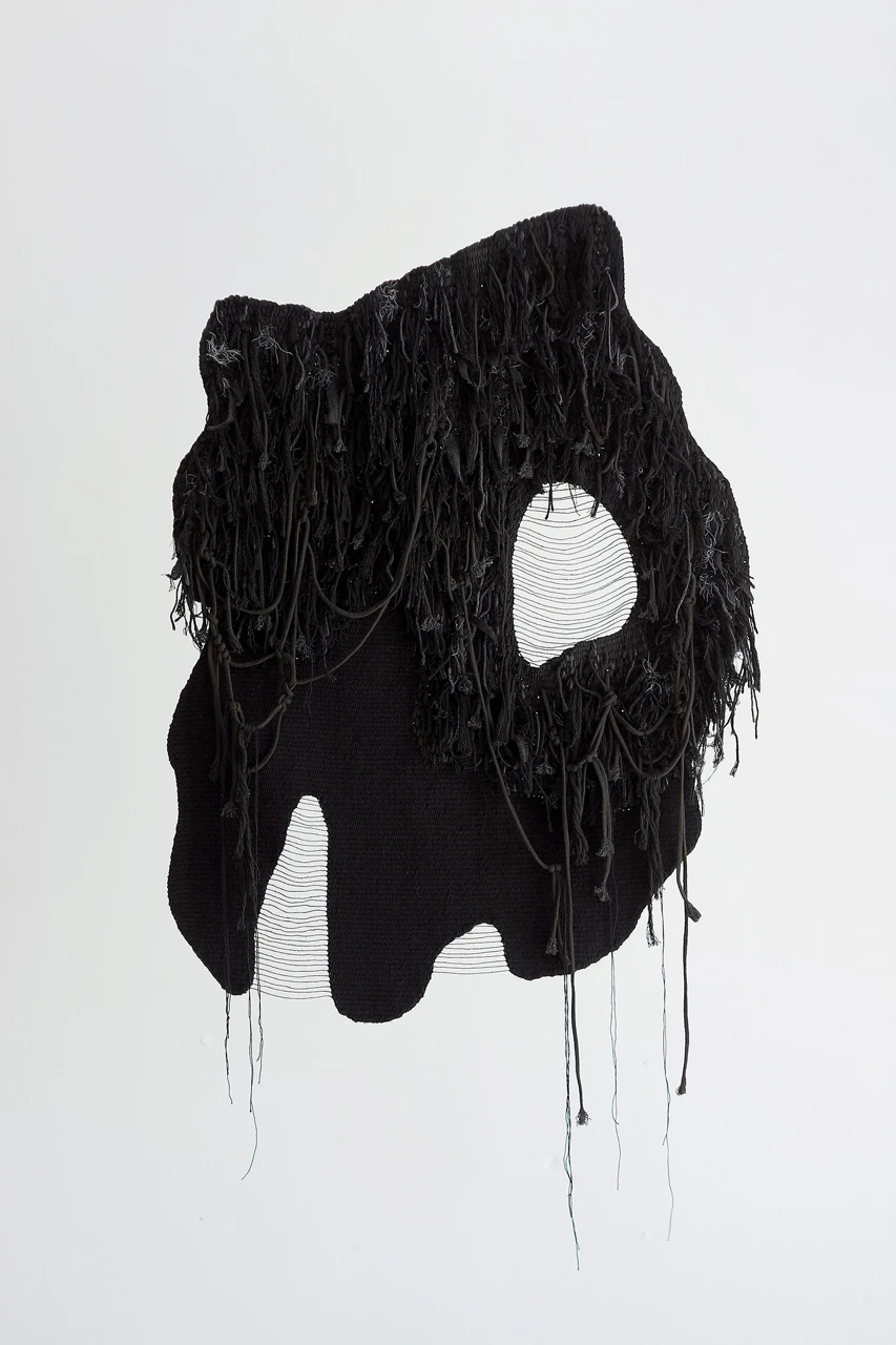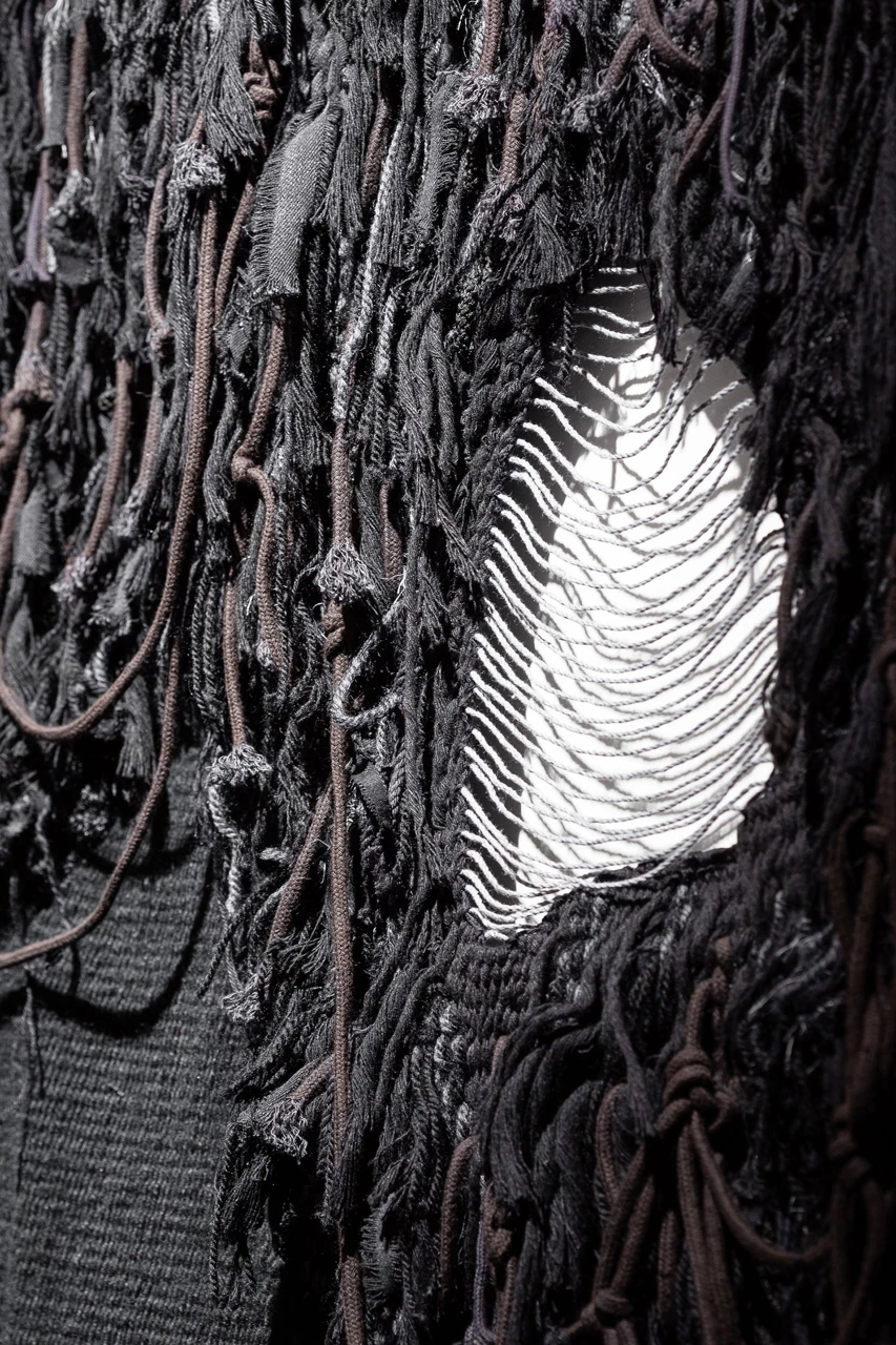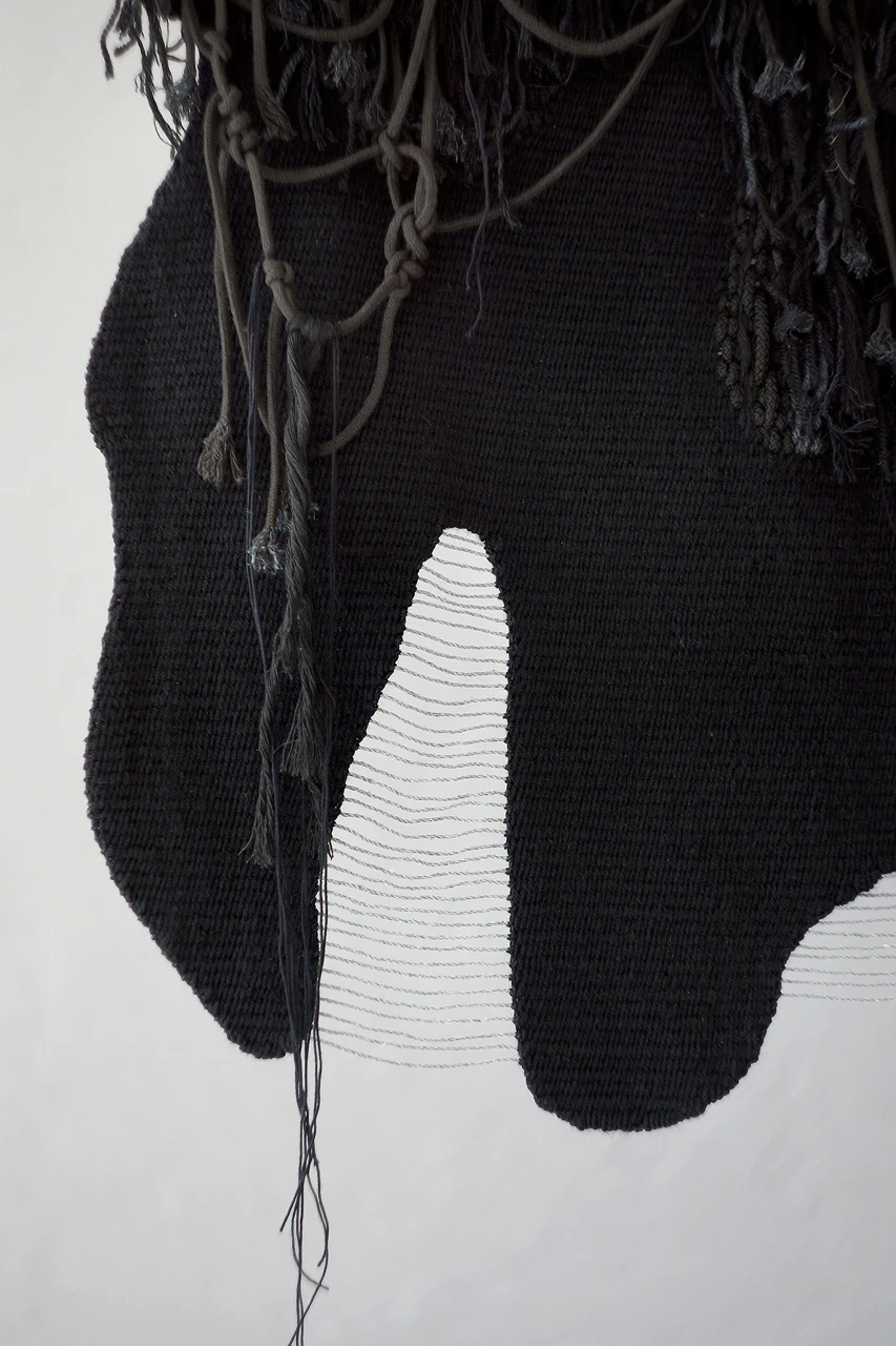 «Gizmo» переводится с английского как «штуковина», что отражает настроение серии: лёгкость, игра, эксперимент. Этот текстиль построен на сознательном нарушении правил традиционного ткачества: прорехи в полотне, нити, выпущенные наружу, асимметрия формы. Композиция напоминает расползающееся пятно чернил или краски.