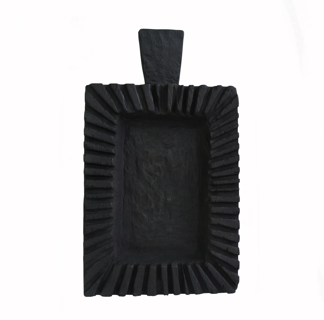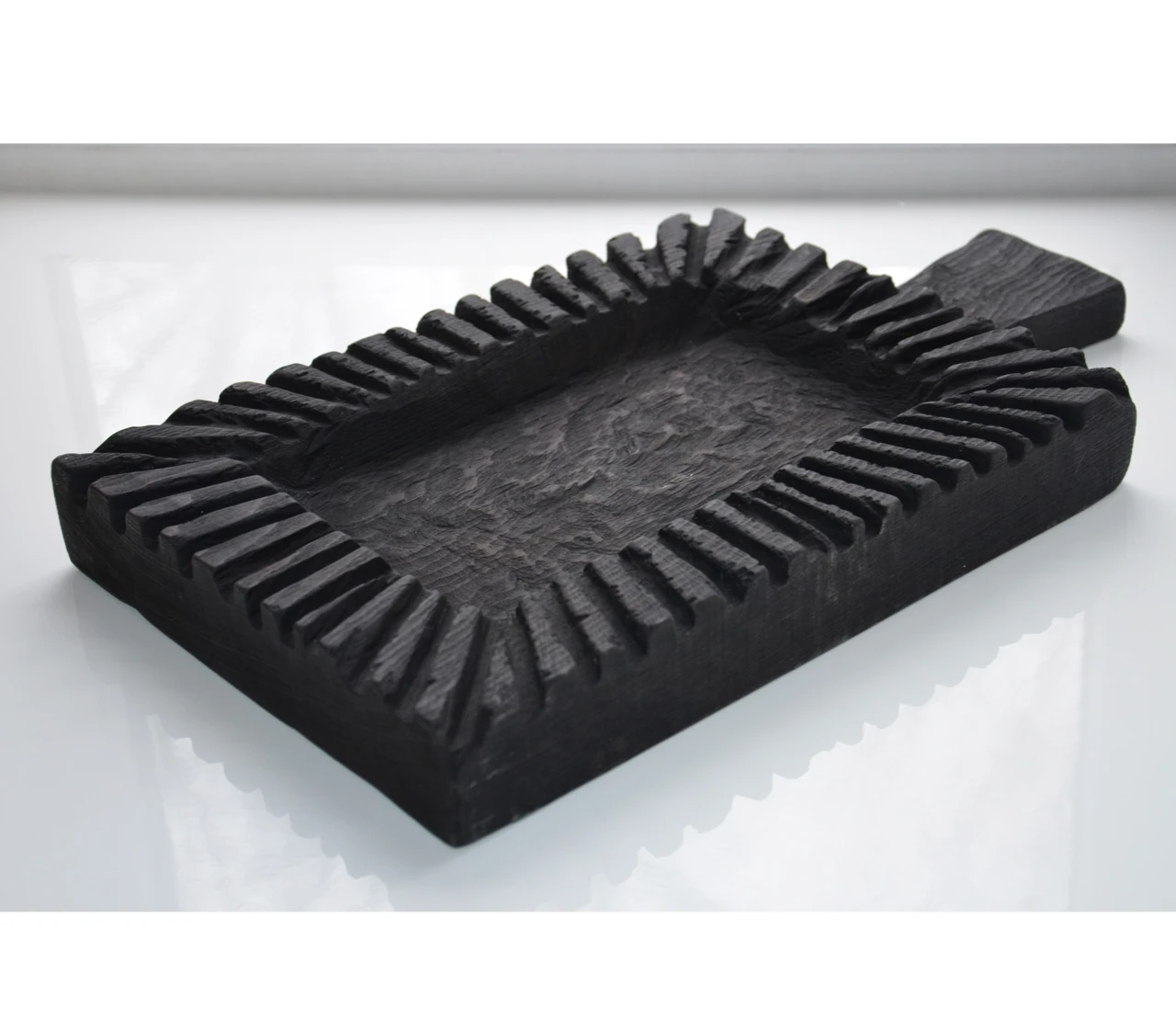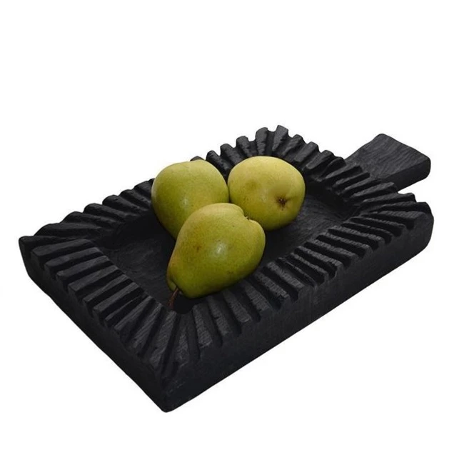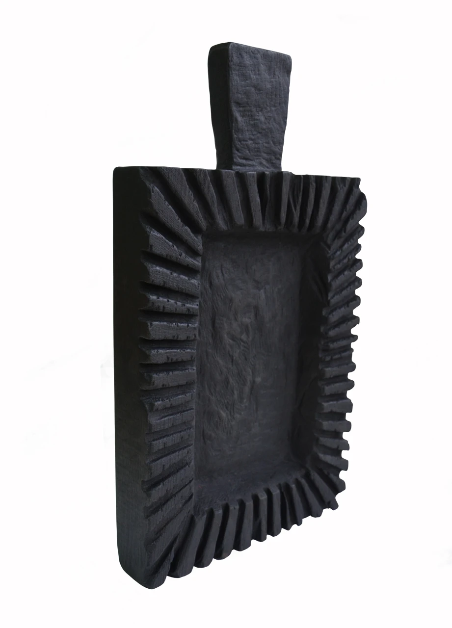 Декоративная деревянная доска — это кухонная утварь и арт обьект одновременно. Полностью ручная работа, вырезана из массивной доски бука. Из инструментов художник использовал только бензопилу. Боковые пропилы, углубление в середине сделаны бензопилой в авторской технике, следы от нее создали характерные узоры на дереве. Далее, после обжига было нанесено защитное колерованное масло для дерева, безопасное для продуктов.