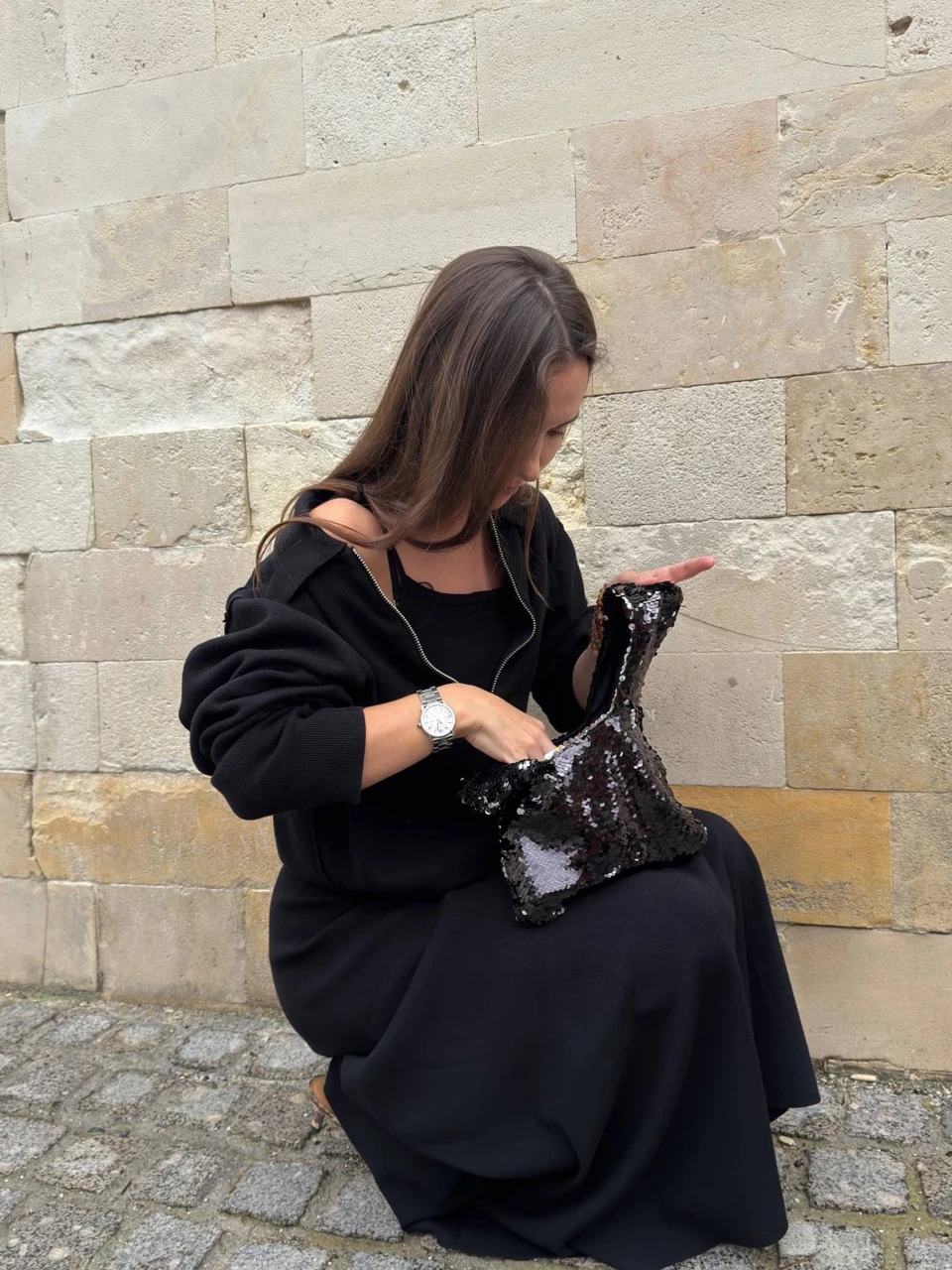 Сумочка-узелок на запястье из черных пайеток.