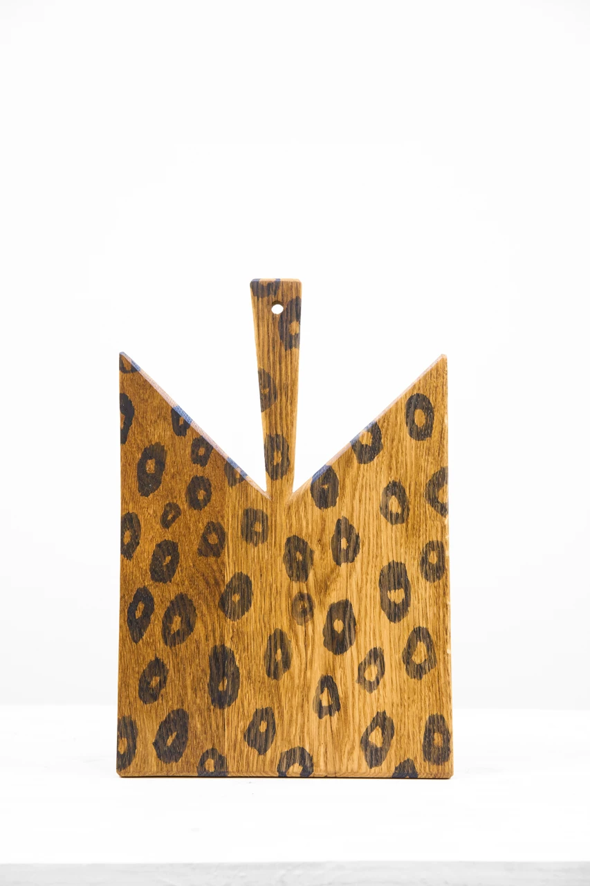 Многофункциональная доска из дуба, изготовлена полностью вручную и имеет авторскую эргономичную форму, а также украшена анималистичным рисунком, нанесенным методом органического чернения. Одинаково хороша для нарезки и для сервировки.