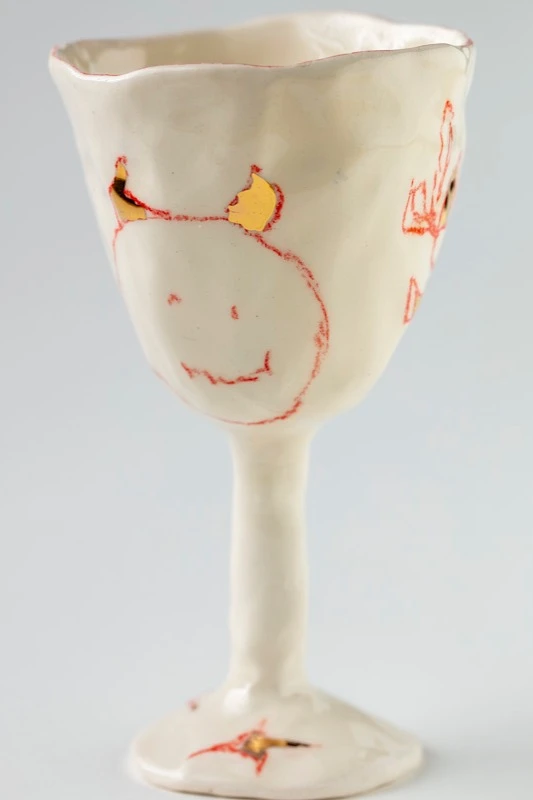 Фужер из керамики на высокой ножке с наивными рисунками и золочением.