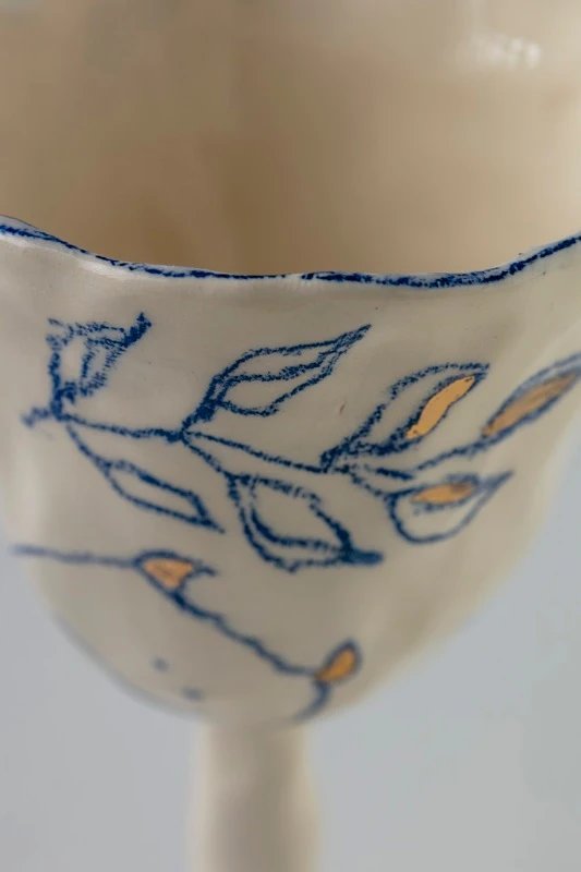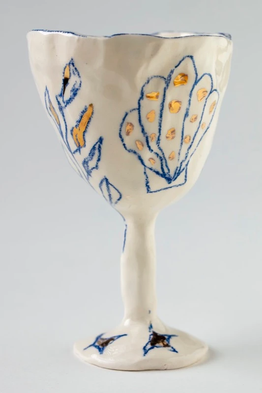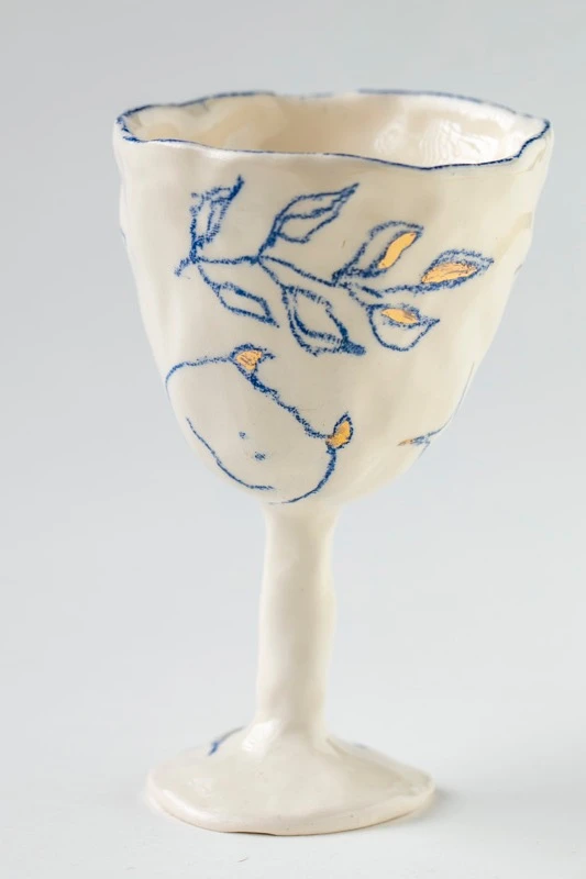 Фужер из керамики на высокой ножке с наивными рисунками и золочением.