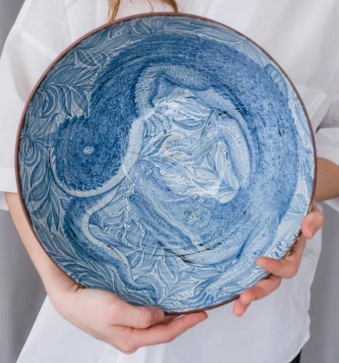 Мои работы не полностью покрыты керамической глазурью. Эта идея пришла мне в голову, когда в очередной раз в музее я смотрела на древние керамические сосуды и увидела нечто привлекательное в том, что утраченная часть сосуда восстановлена реставраторами, но она совершенно пуста. Что же изобразил в этом месте художник той эпохи? Это загадка. А я люблю загадки и решила воспроизвести этот прием в своих работах. Я заливаю изделия глазурью лишь частично, и зачастую глазурь рисует свой рисунок и определяет, что будет утрачено, а что нет. После того, как я покрыла изделие глазурью, я убираю лишние пятна, которые выглядят не очень живо. После этого уже наношу сюжет с помощью подглазурных красок и пигментов.