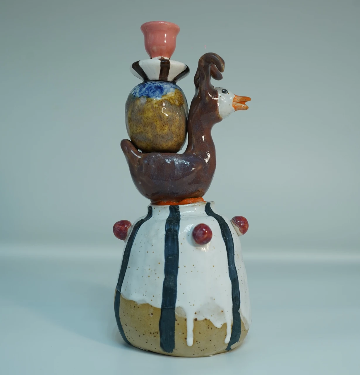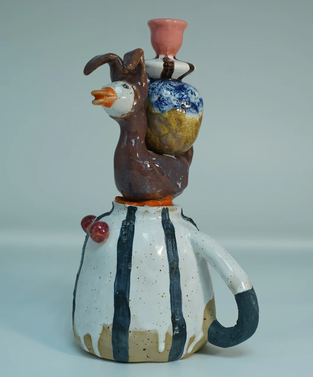 Керамическая скульптура — это история о Гусе, который, поселившись на перевёрнутой кружке в полоску и надев костюм зайца, стал хранителем уютного света; её можно и нужно использовать в качестве подсвечника. Основой скульптуры стали разрозненные фрагменты керамики, когда-то слепленные для другой композиции, но оказавшиеся неподходящими и заброшенными. Работа существует в поле авторского мифа «Страны керамики», где исследуется ключевая для художника тема: поэтика «испорченного» объекта и превращение осколков в целостный нарратив.