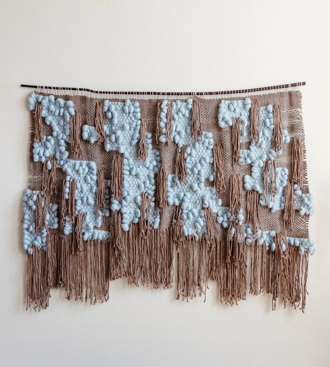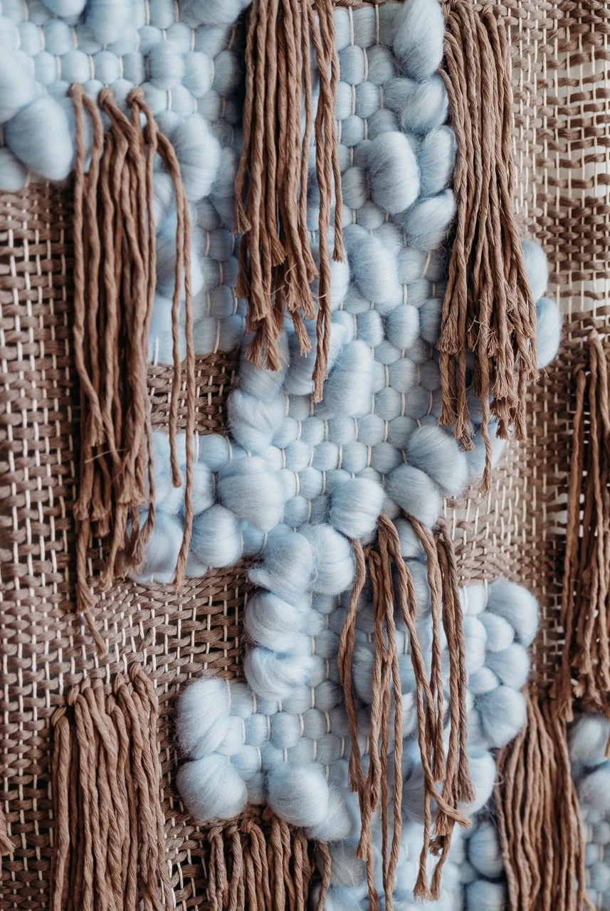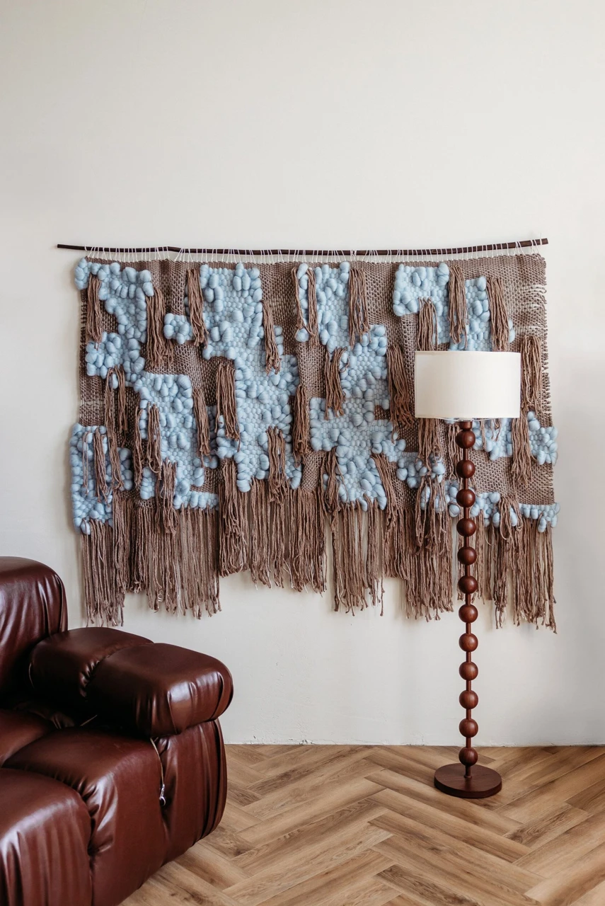 Уютный текстильный арт-объект ручной работы. Мягкие шерстяные «ягодки» небесно-голубого цвета контрастируют с теплым коричневым фоном, создавая объемную, органичную композицию. Натуральные материалы и авторское плетение делают «Ягодки» акцентной деталью интерьера, которая добавляет тактильности и уюта.