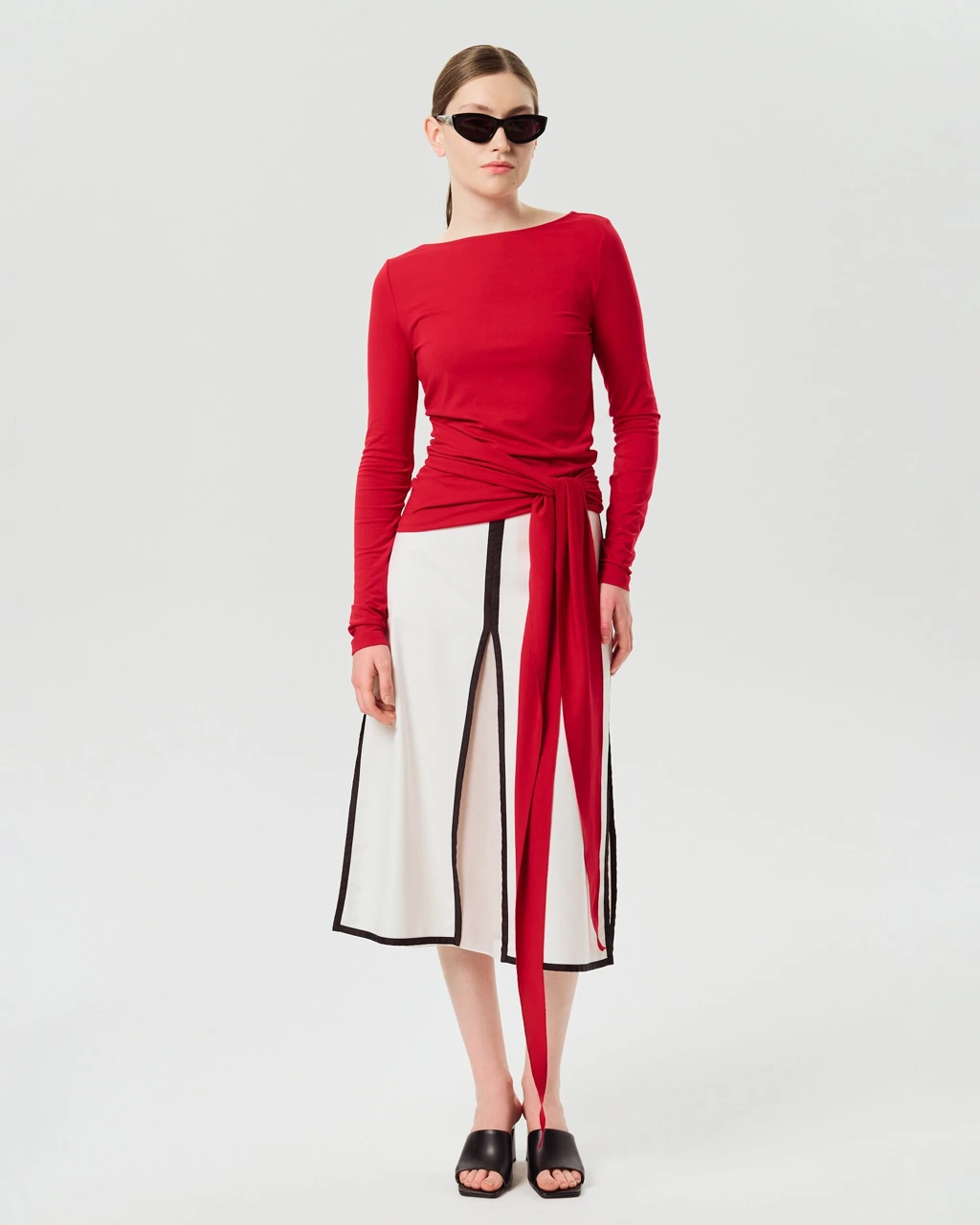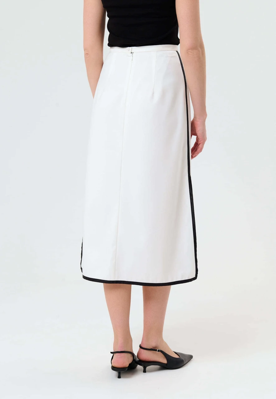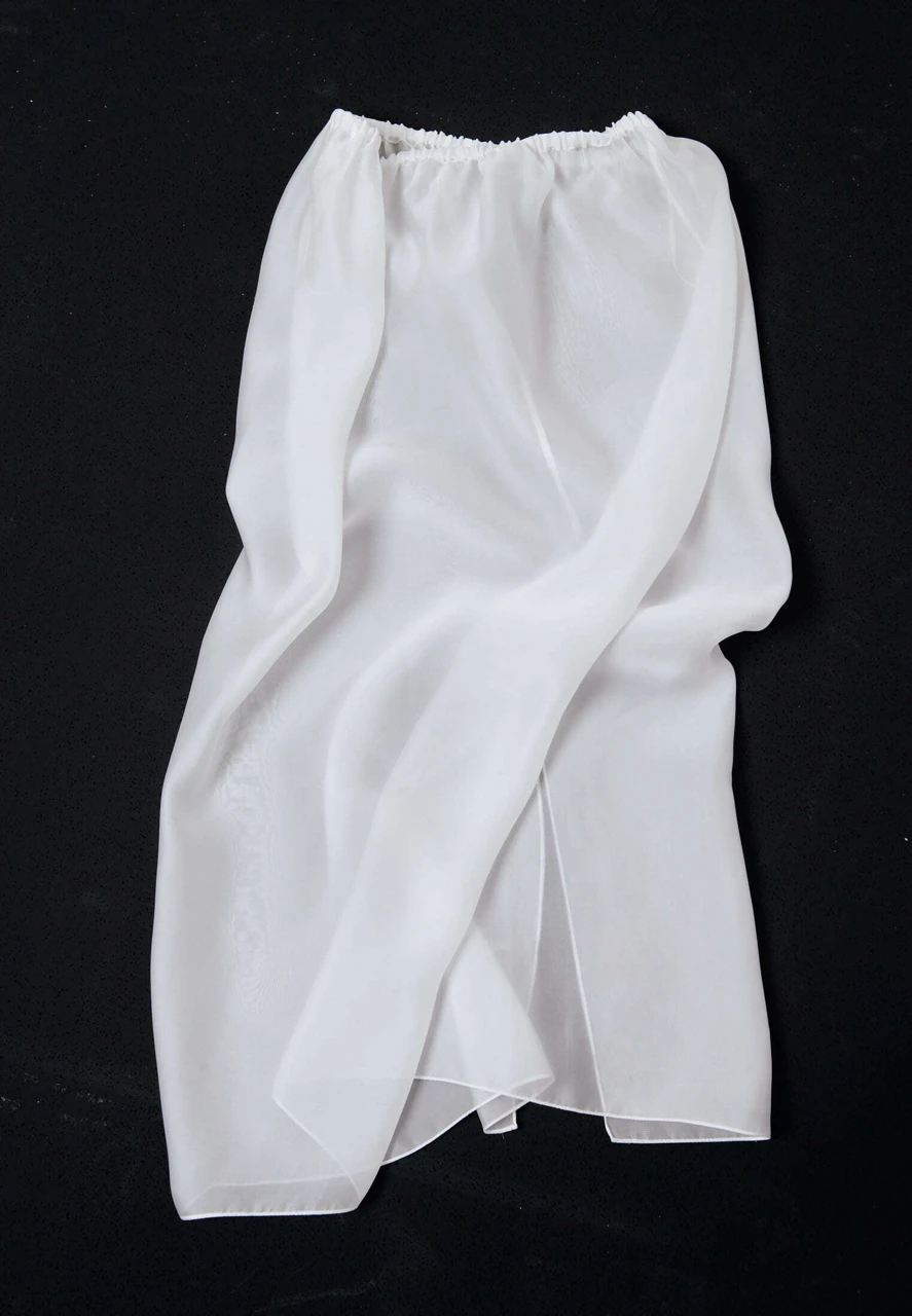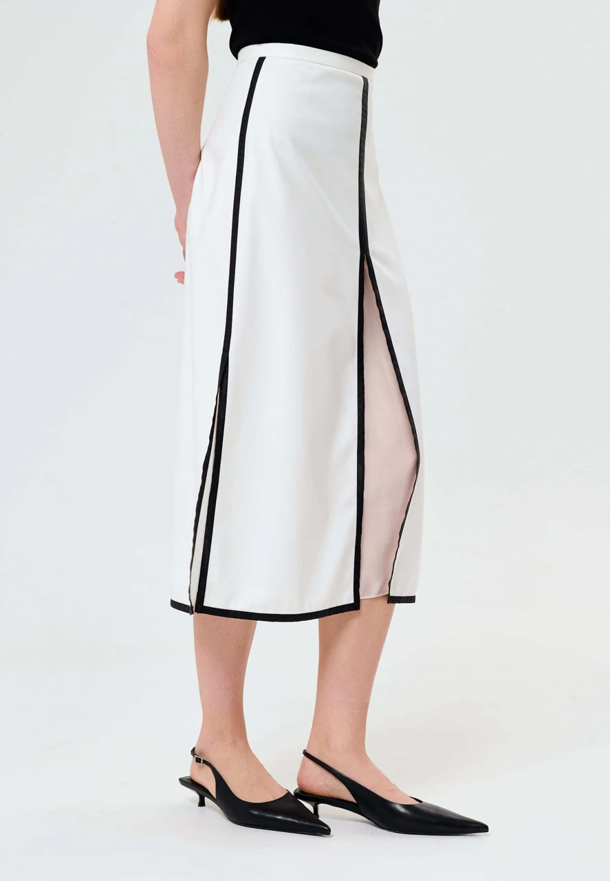 Геометрия и контрастные окантовки — узнаваемые штрихи бренда. Юбка А-силуэта с черными окантовками и разрезами — настоящая находка для стилизаций — может использоваться как самостоятельная вещь, так и с брюками, леггинсами. В комплекте идет нижняя белая прозрачная юбка на резинке.