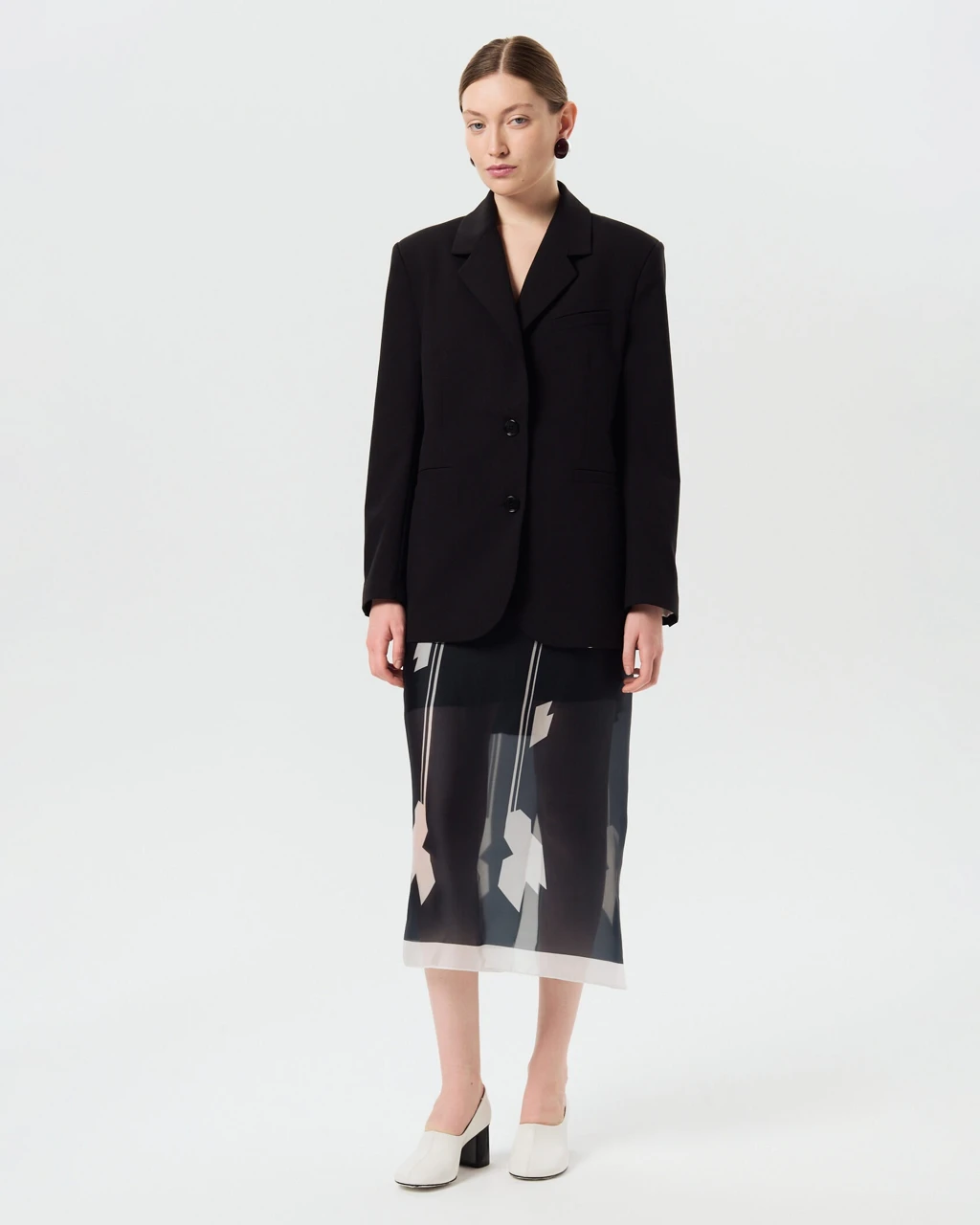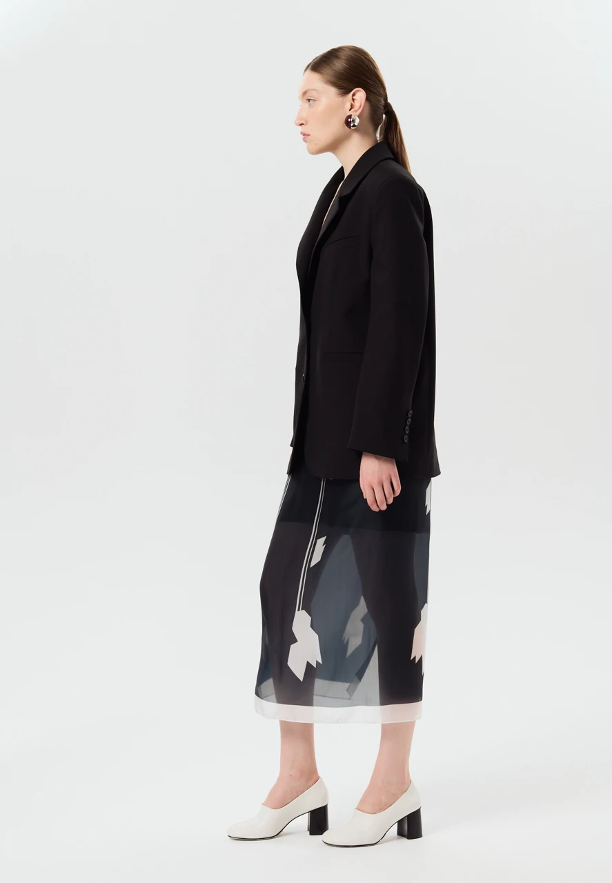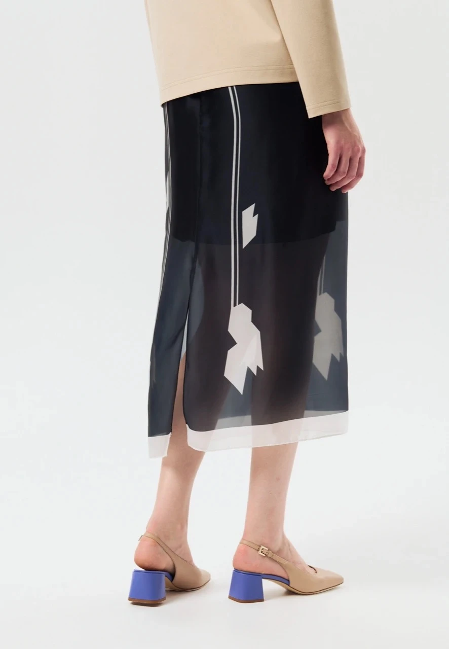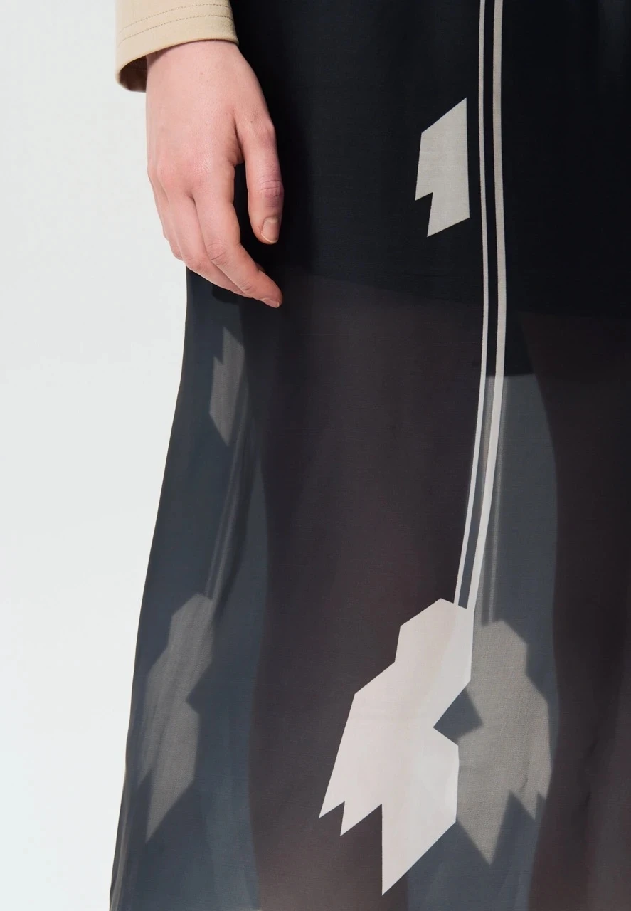 Юбка из лёгкой полупрозрачной ткани с авторским принтом — воплощение конструктивистской эстетики, вдохновлённой наследием художниц Варвары Степановой и Любови Поповой. Наш авторский принт на ткани в виде цветка передает формулу образцового орнамента для тканей 1920-х годов — динамичный раппорт, геометрическая основа.
