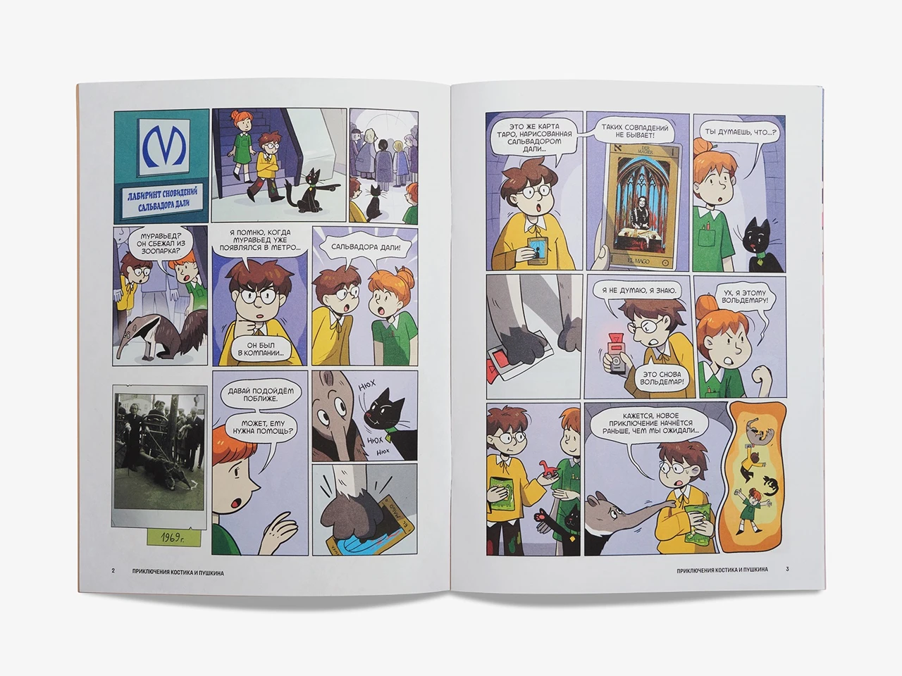 В этом номере наших постоянных героев — Костика, Сашку и Пушкина — просто не узнать! Они растягиваются, уменьшаются, растекаются лужицами… А всё для того, чтобы органично влиться в картины одного из самых неординарных художников ХХ века — великого Сальвадора Дали.