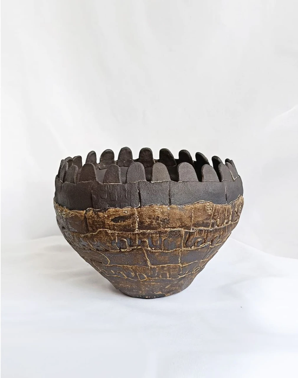 Эта ваза — настоящий предмет с характером, соединяющий в себе деревенскую простоту и современную керамическую эстетику. Формой она напоминает традиционный чугунок, но благодаря ручной лепке обретает особую, «живую» пластику. Ее поверхность собрана из множества мелких кусочков глины, словно лоскутное одеяло, что делает фактуру невероятно тактильной и теплой.