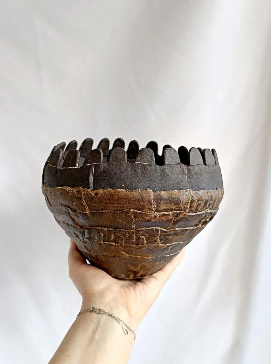 Особый шарм изделию придают выступающие полукруглые зубчики по окаймлению — неожиданная деталь, которая придает силуэту индивидуальность и легкую наивность.