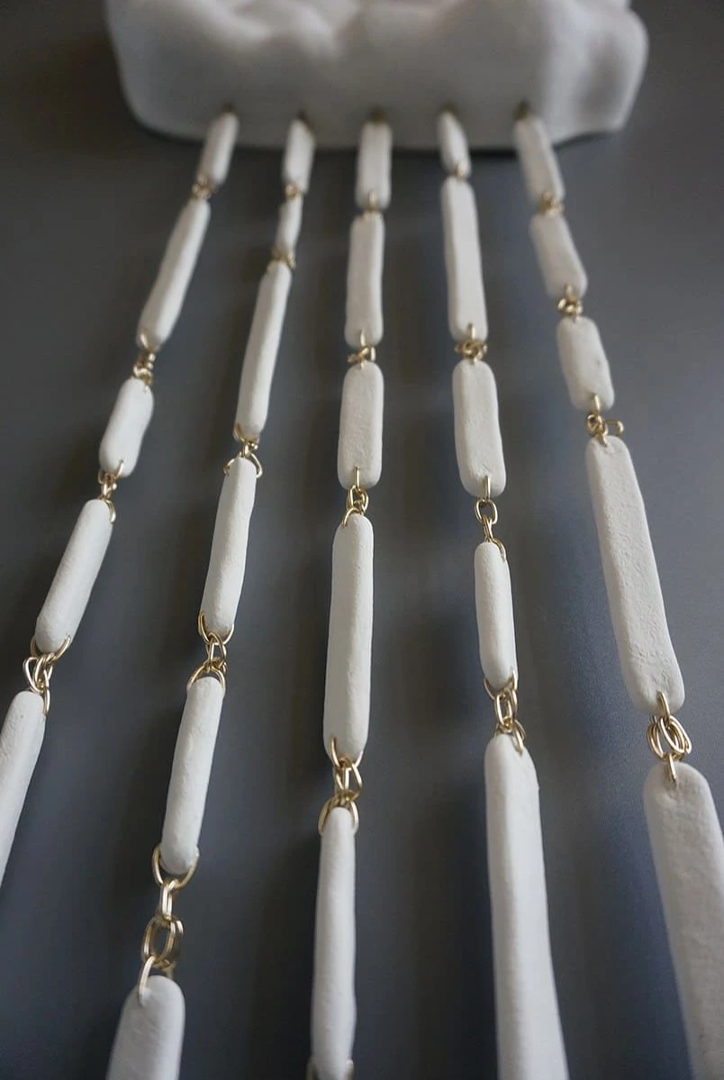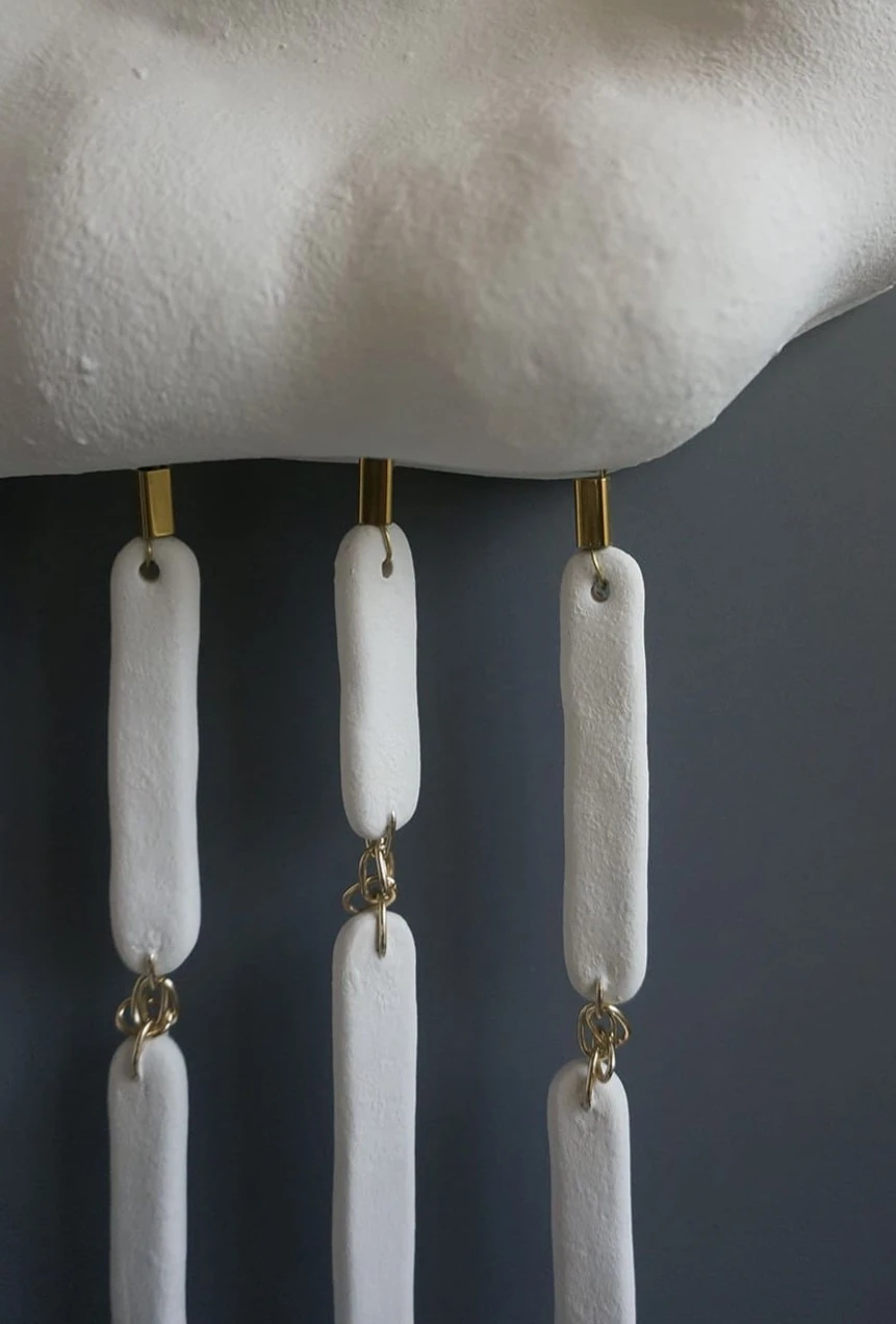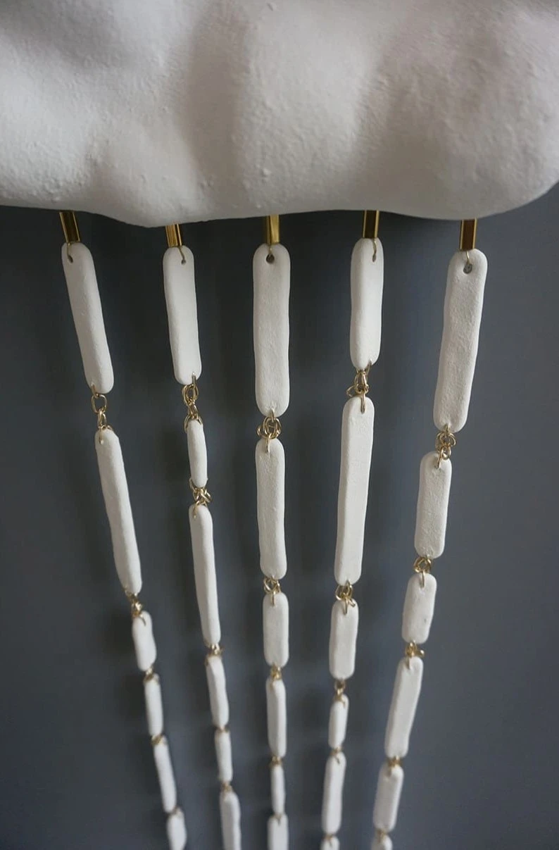 Изящное керамическое панно, изображающее облако с дождём, бережно вылепленное из белоснежной глины. Деликатные линии из струящихся металлических цепочек и нежных керамических бусин придают этому изделию особую утонченность.