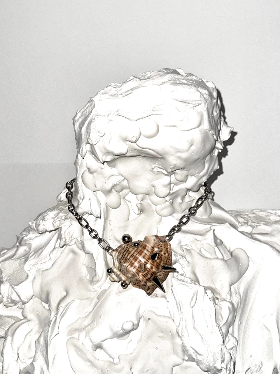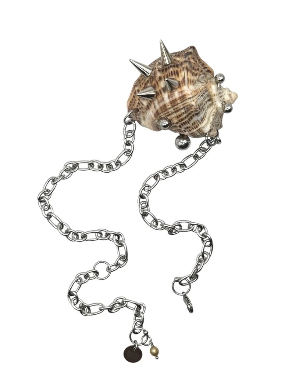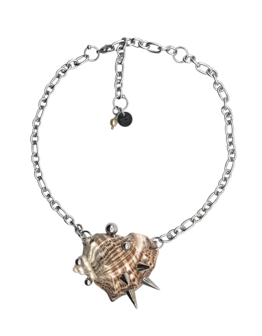 Акцентный чокер с большой морской раковиной, украшенной пирсингом и шипами. Цепочка из ювелирной стали регулируется 0-46 см.