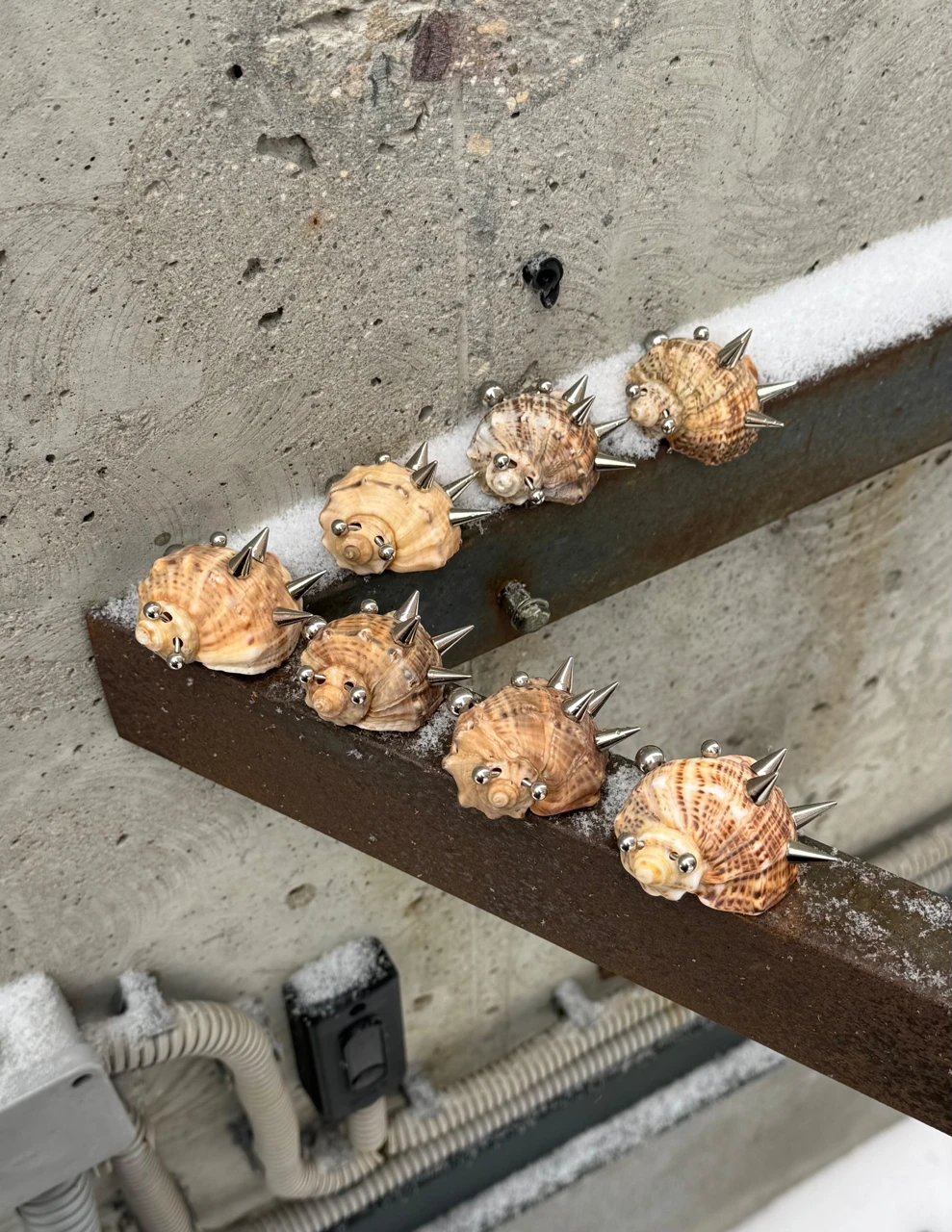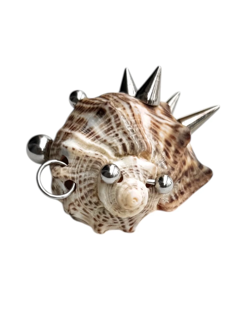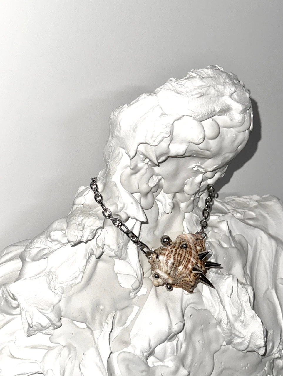 Акцентный чокер с большой морской раковиной, украшенной пирсингом и шипами. Цепочка из ювелирной стали регулируется 0-46 см.