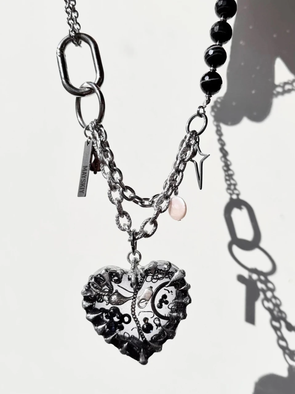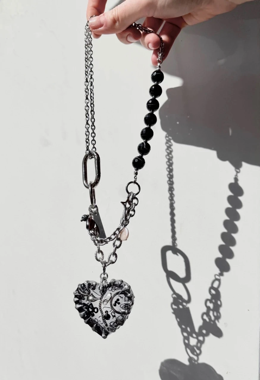 Сердце из эпоксидной смолы в металлическом обрамлении, цепи из нержавеющей стали, будто связывающие время, бусины чёрного оникса — для баланса. Колье, которое говорит за себя — тихо, но с характером.