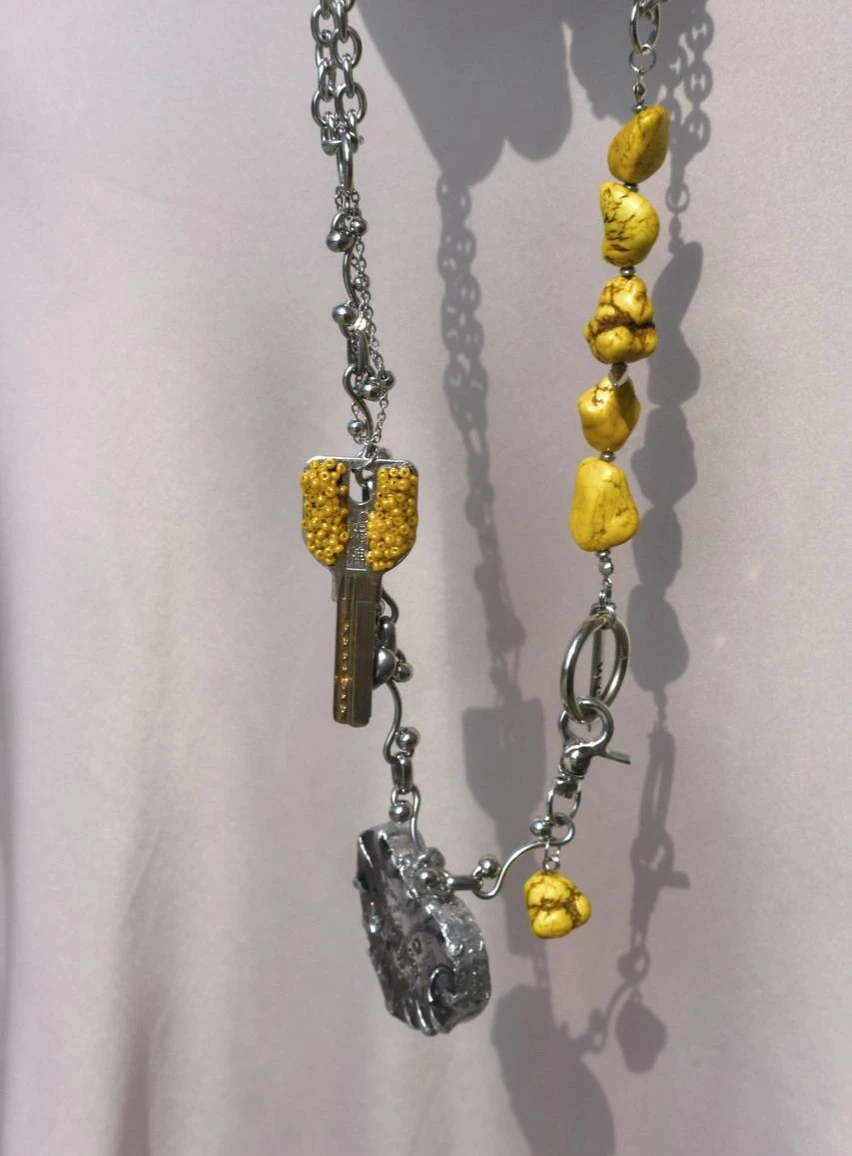Колье на стальных цепях с акцентами из желтого говлита.