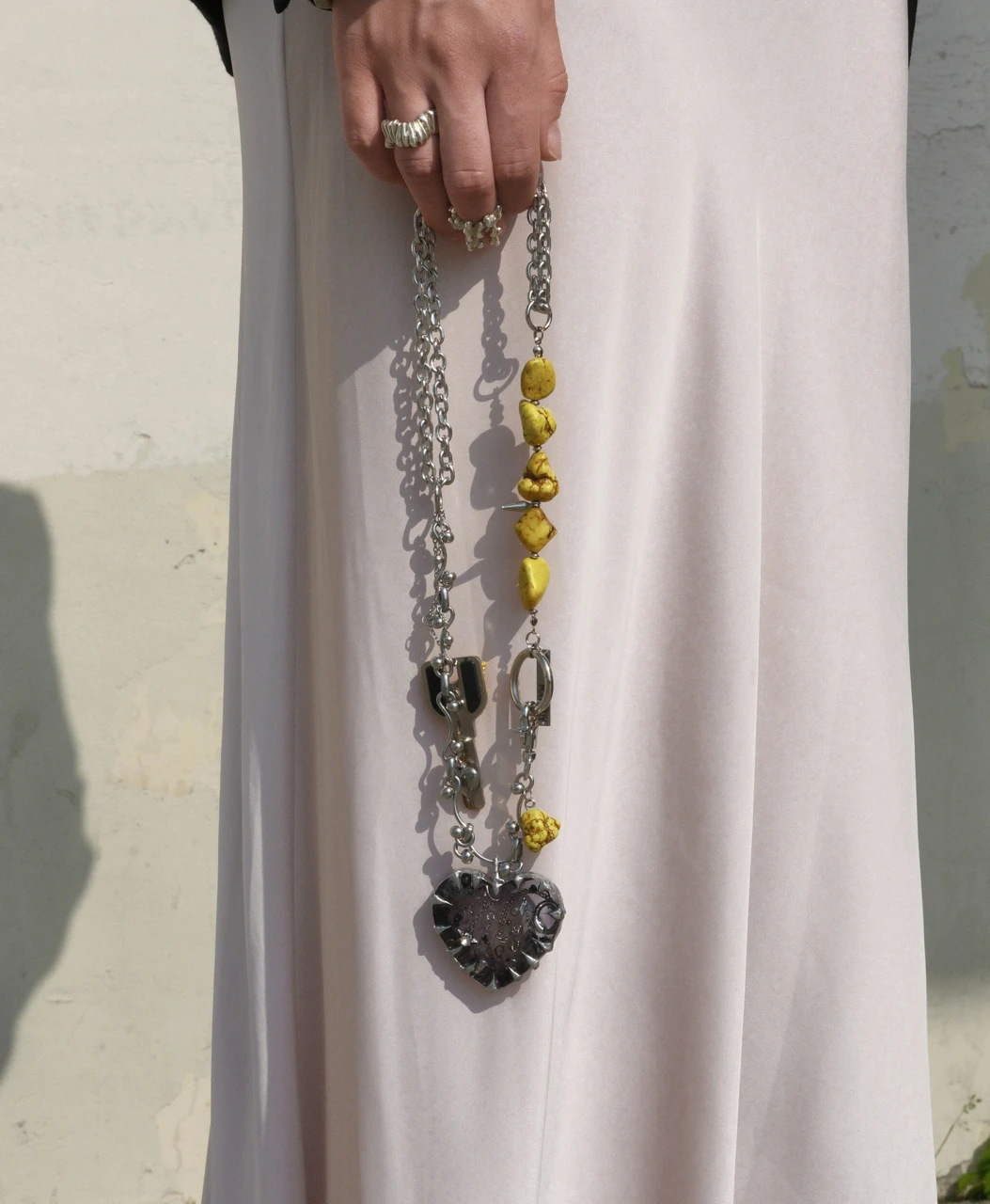 В центре — сердце в оловянной оправе: под слоем смолы бережно сохранены осколки когда-то любимых украшений. Завершающий штрих — ключ, украшенный желтым бисером.