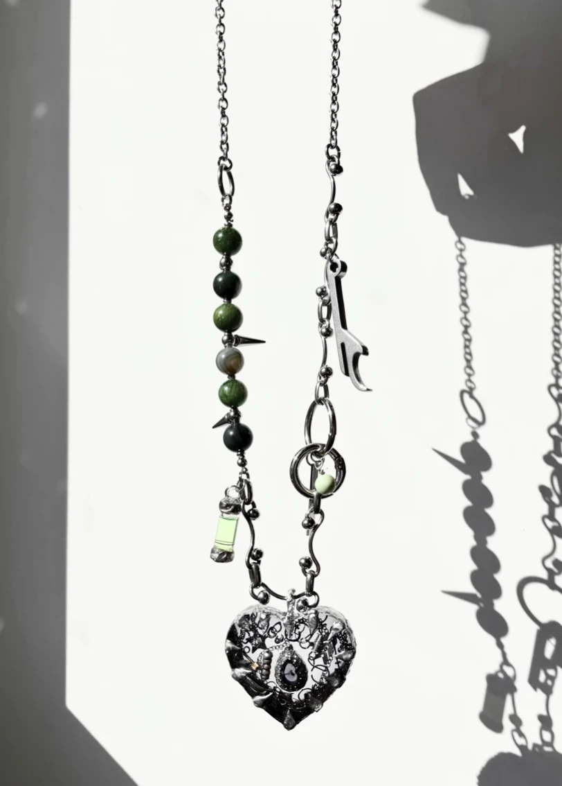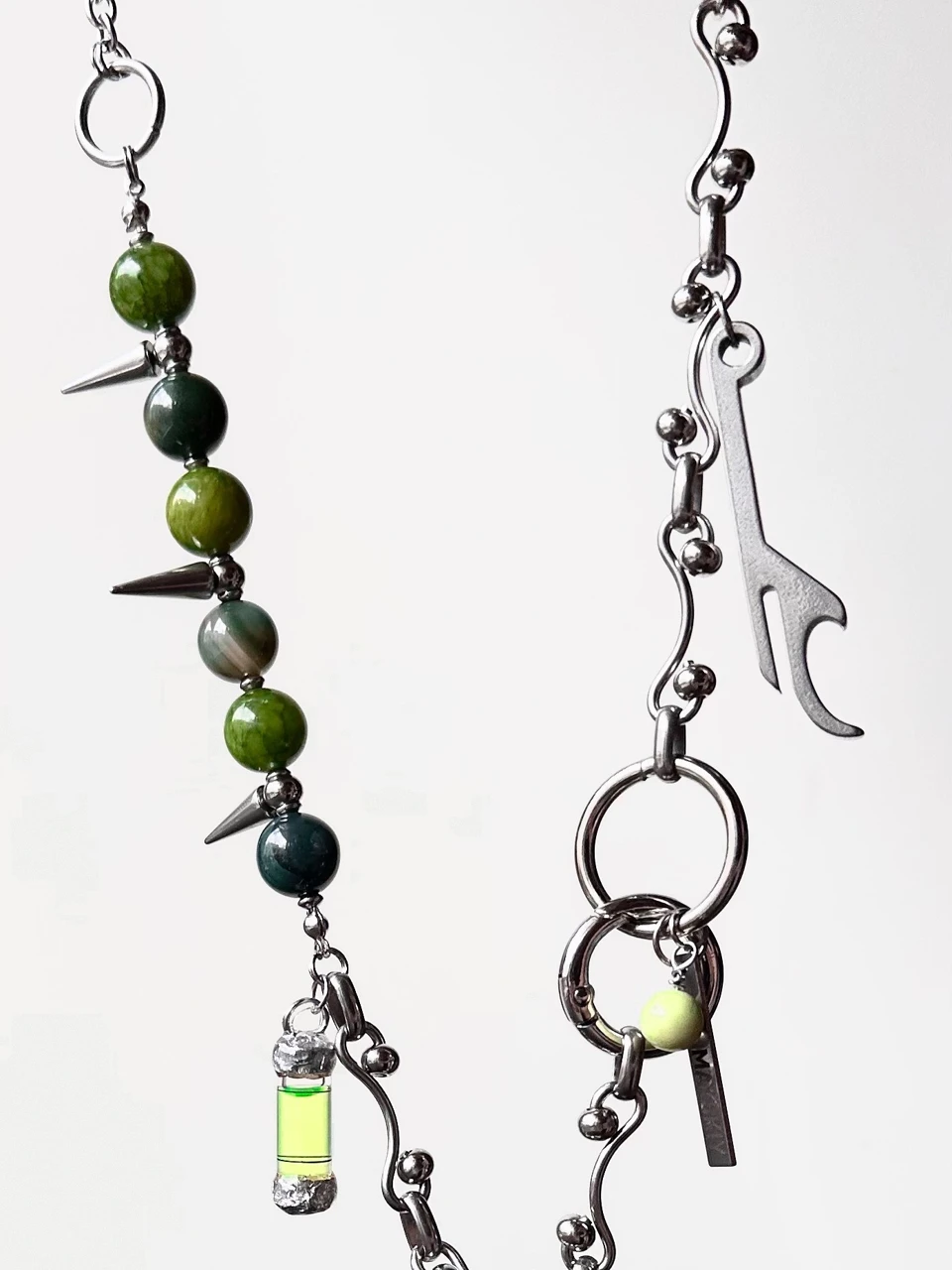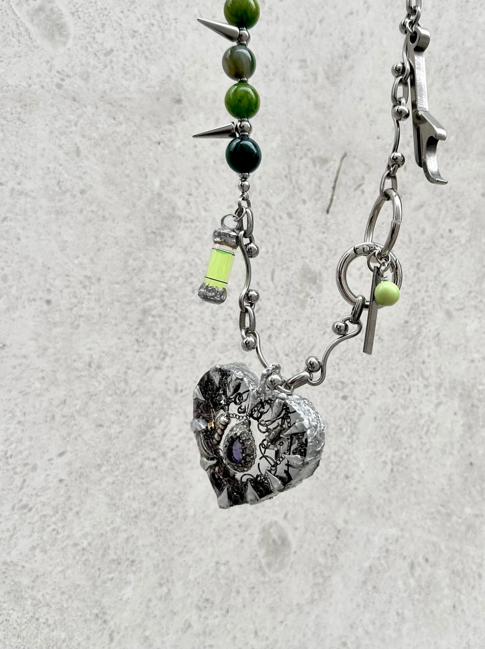Это колье не про нежность, а про выживание в городе. Нефрит для спокойствия, уровень покажет, кто тут ровный, железное сердце для стойкости, а открывашка для бутылок решает вопросы быстрее любого психолога.