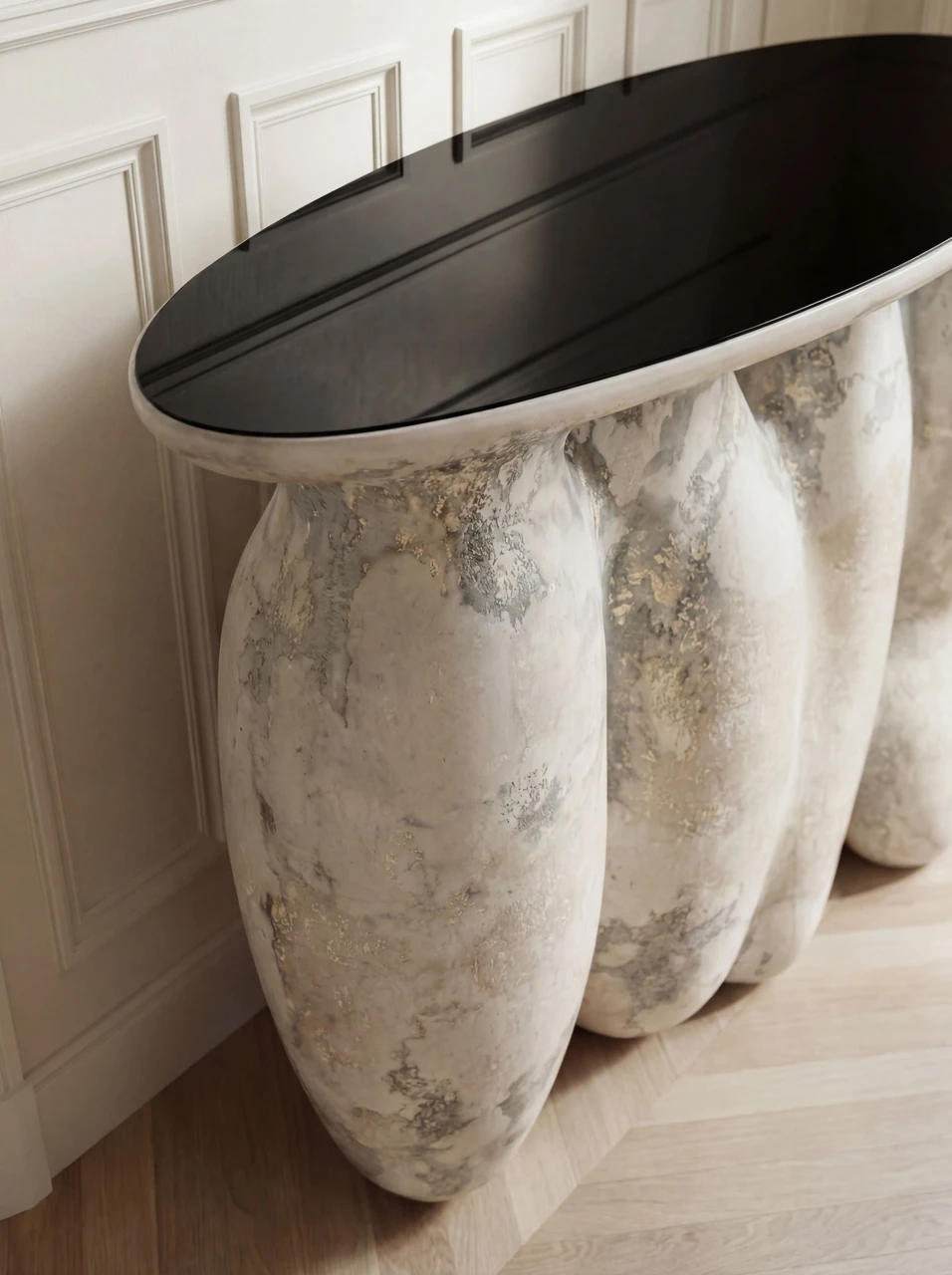Столешница — каленый стальной лист, покрытый рояльным лаком, изножье — минерально-композитная смесь