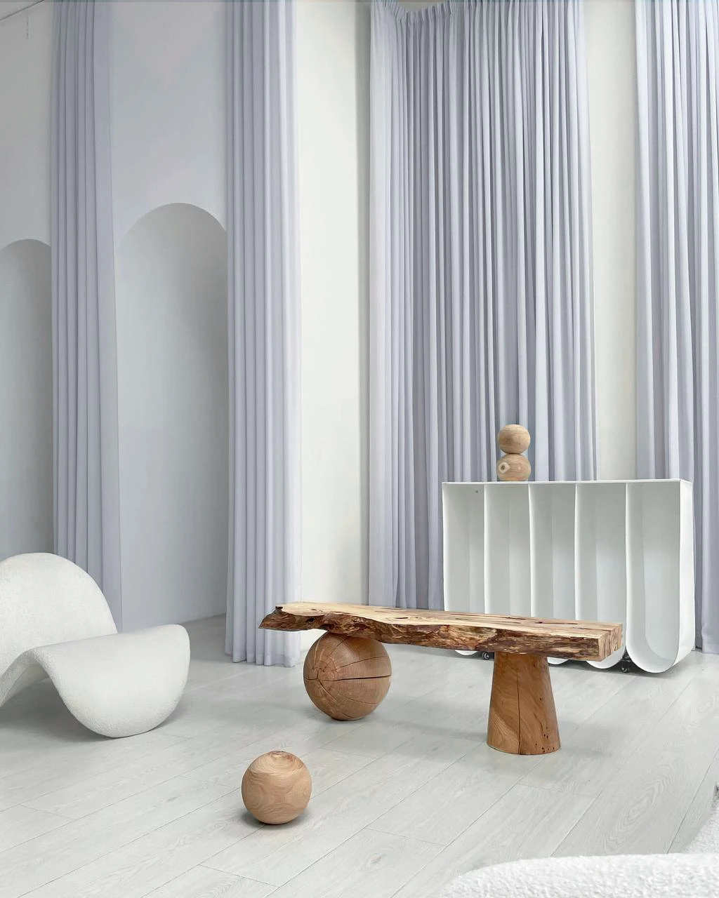 Контраст органической фактуры и строгих объёмов отсылает к пластическим поискам русского авангарда и проунам точке встречи архитектуры, живописи и предмета. Лавка существует между функцией и скульптурой, между тяжестью материала и визуальной лёгкостью композиции.