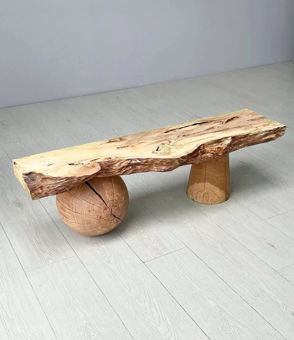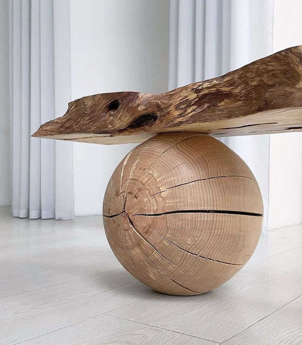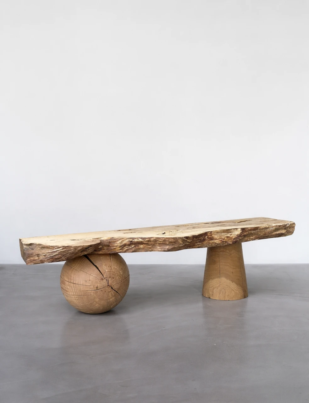 Лавка построена на диалоге природной материи и чистой геометрии. Сиденье из массива граба одной из самых плотных и твёрдых пород сохраняет живой край и естественный рисунок волокон, превращая поверхность в почти ландшафтную линию. Внизу композицию удерживают две первичные формы — шар и усечённый конус, создающие ощущение неустойчивого равновесия и пространственного напряжения.