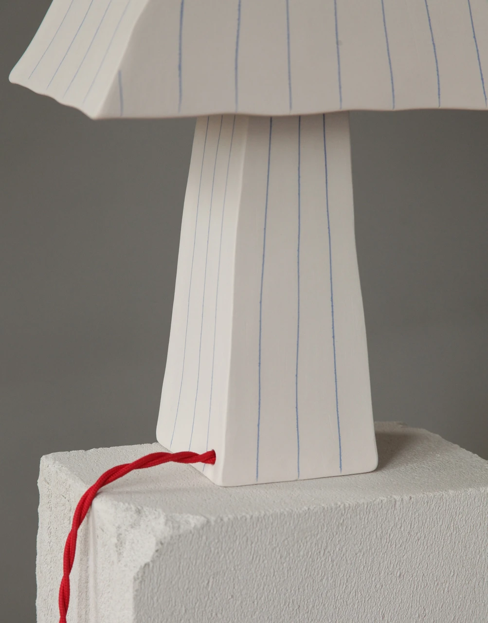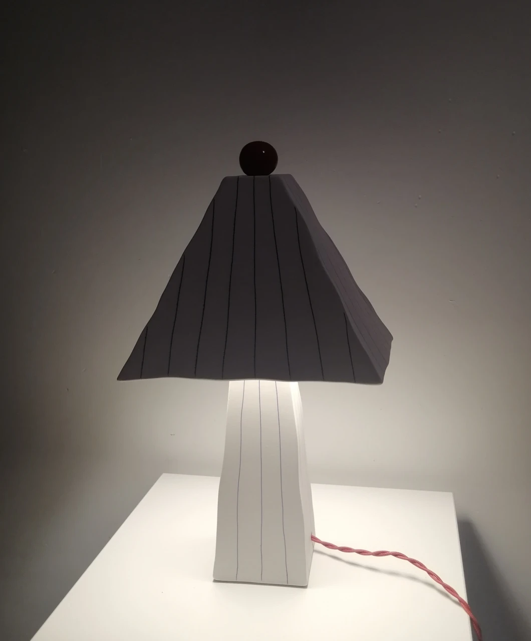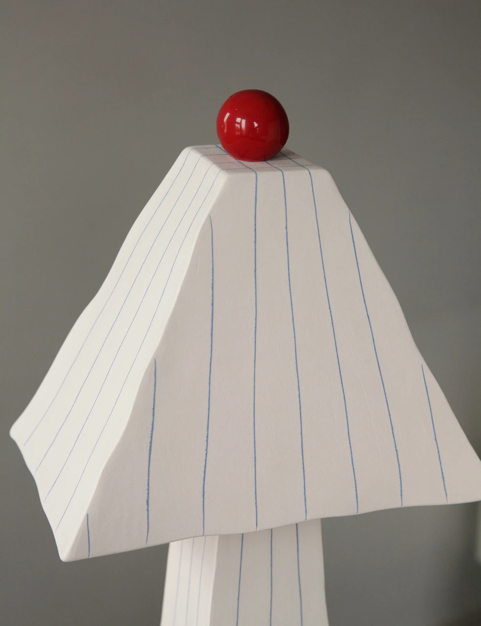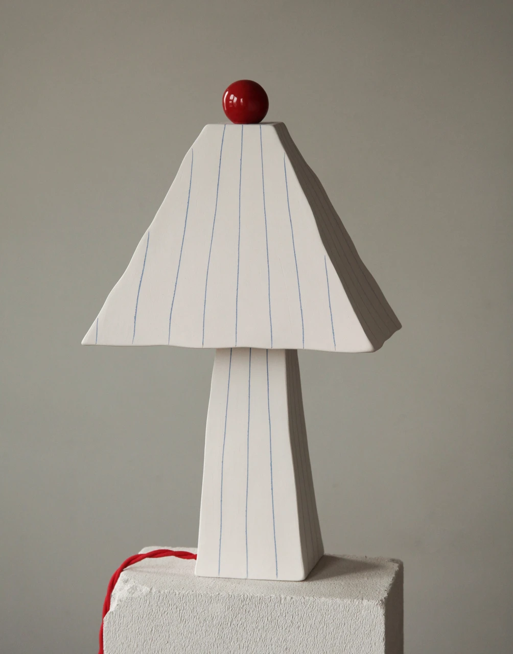 Лампа ручной работы выполнена в технике «мисима». Тонкие голубые полоски на матовом основании и ярко красный глянцевый шарик создают контраст текстур. Съемный абажур имеет лёгкую конструкцию для замены лампочки. Патрон под е27.