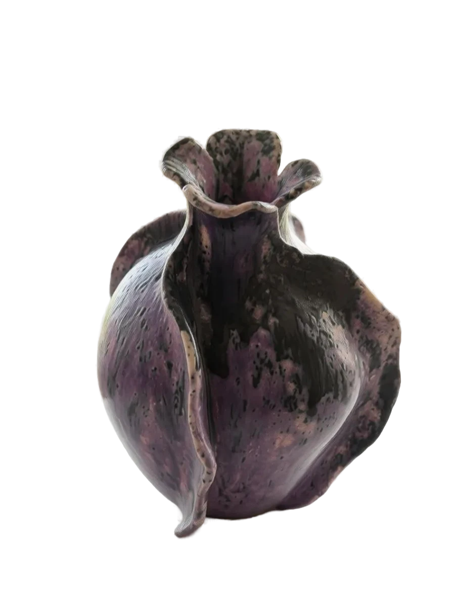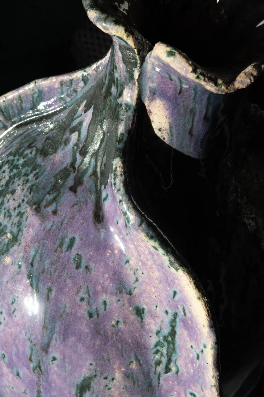 Фиолетово-лавандовая глазурь с темными акцентами создает эффект естественности, природной подлинности, где каждый переход цвета подобен уникальному узору души. Волнообразные края сосуда, устремленные вверх, символизируют процесс постепенного раскрытия внутреннего «Я». Как цветок в саду медленно распускается навстречу солнцу, так и человек постепенно открывает свою истинную сущность, позволяя внутренней красоте проявиться вовне. Истинная красота сложна, многогранна, со своими тенями и светлыми участками — именно это делает ее подлинной и ценной. Темные акценты на фиолетовом фоне подобны жизненному опыту, который формирует характер и добавляет глубины личности. Эти «тени» не скрывают красоту, а подчеркивают ее, делая более насыщенной и осмысленной.