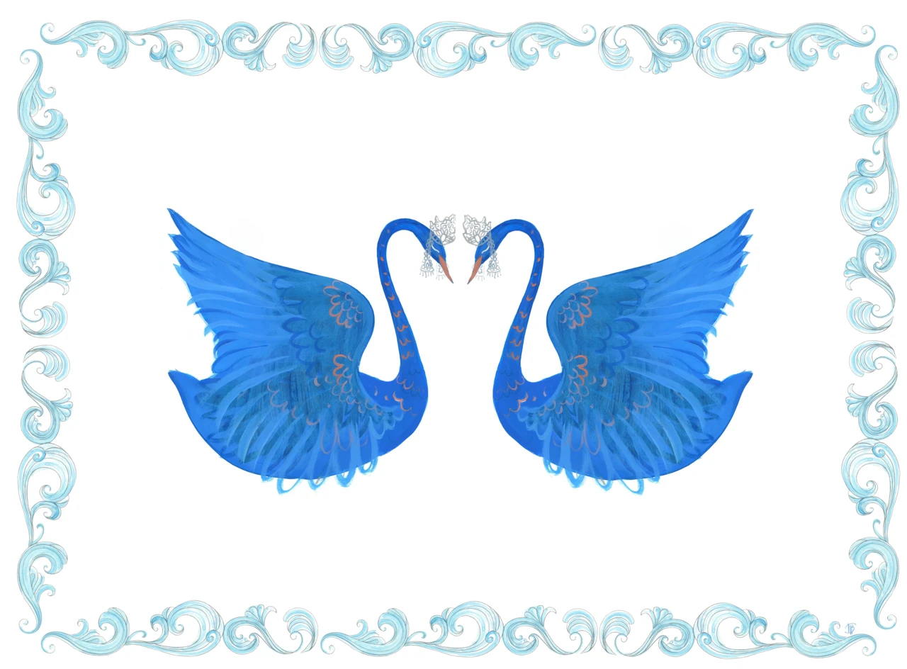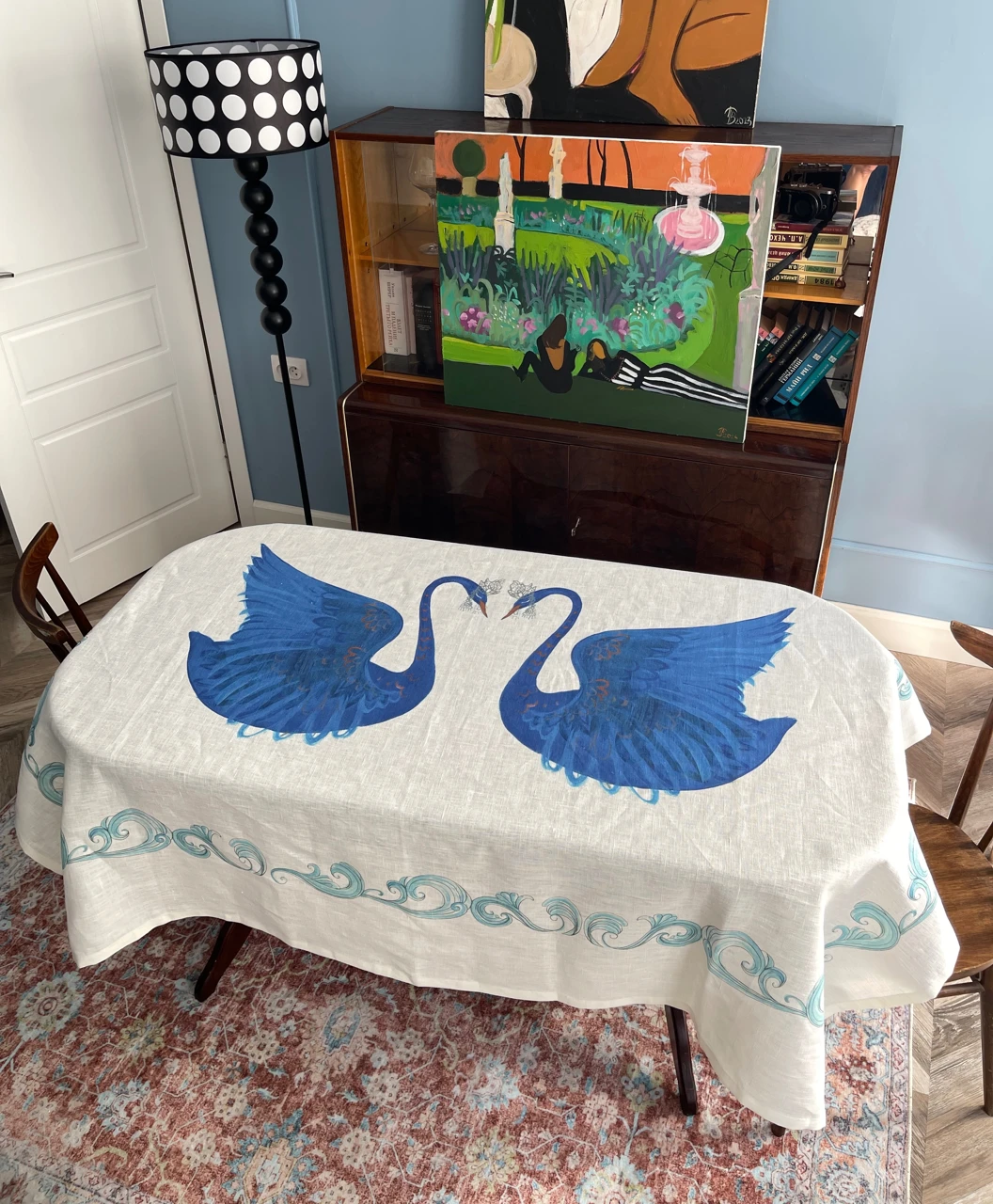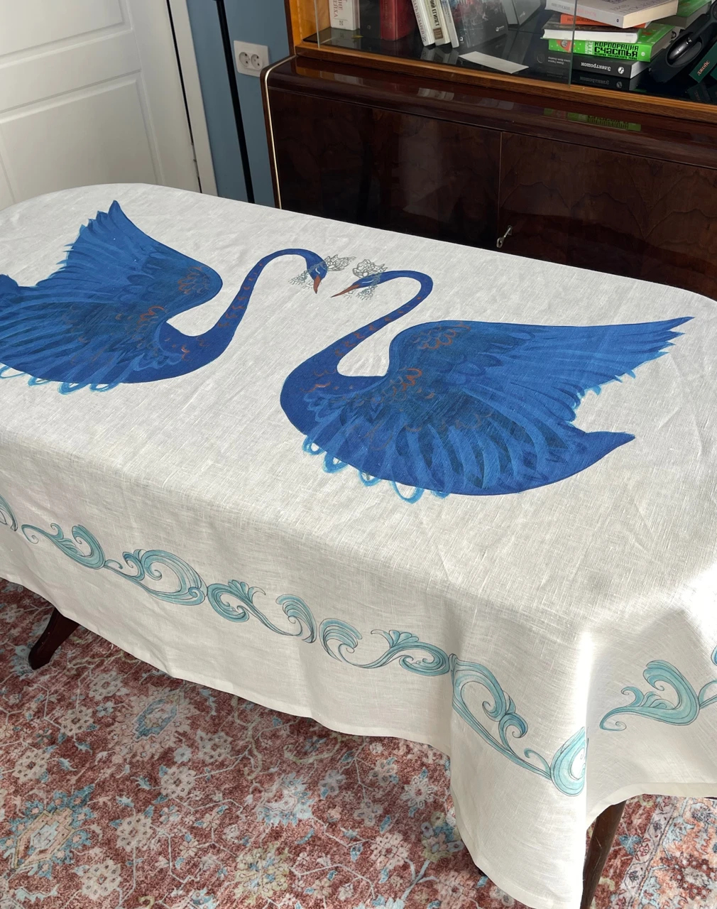Эта льняная скатерть с двумя синими лебедями, украшенными коронами, вдохновлена образом Царевны-Лебедя из сказки Пушкина — символом красоты и благородства. Волнистый голубой орнамент по краям не только отражает водную стихию, но и служит стильным архитектурным элементом скатерти.