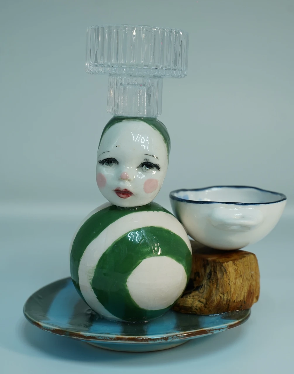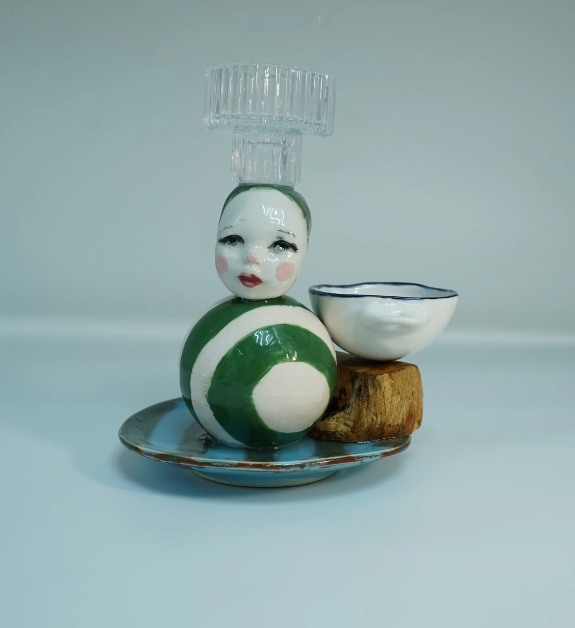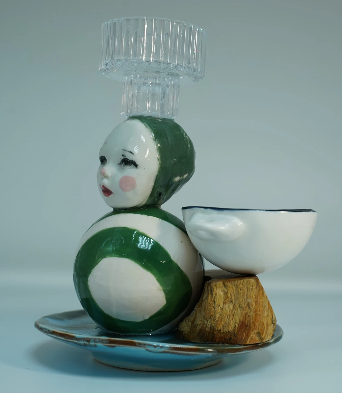 Здесь я не только леплю, но и собираю, выступаю в роли проводника между «бракованными изделиями» и новым назначением вещей. Основой скульптуры стали разрозненные фрагменты фарфора, когда-то слепленные для другой композиции, но оказавшиеся неподходящими и заброшенными. Внимательно и бережно они соединены в вертикальную пирамиду — не разъёмную, как традиционная игрушка, а целостную, как башня. Работа существует в поле авторского мифа «Страны керамики», где исследуется ключевая для художника тема: поэтика «испорченного» объекта и превращение осколков в целостный нарратив.