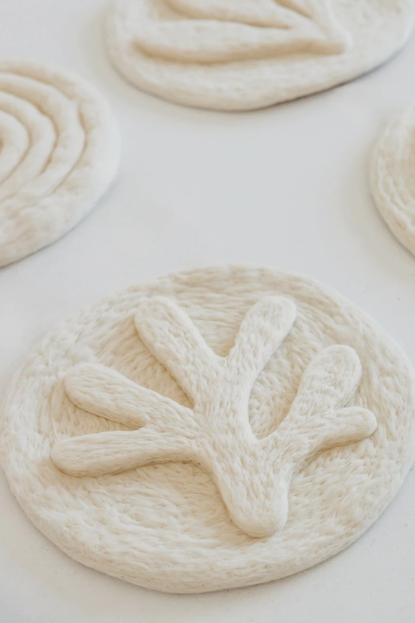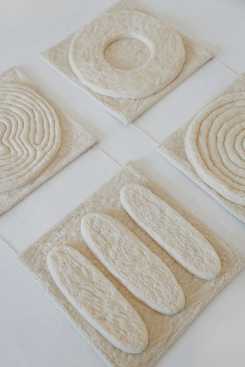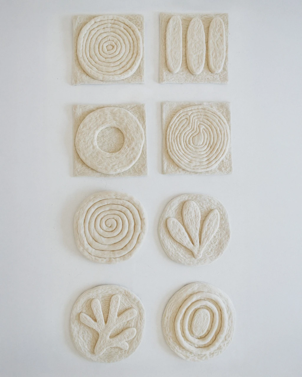 Панно «Коды» — это коллекция текстильных элементов ручной работы. Каждый круг или квадрат выполнен в авторской технике из натуральной шерсти.