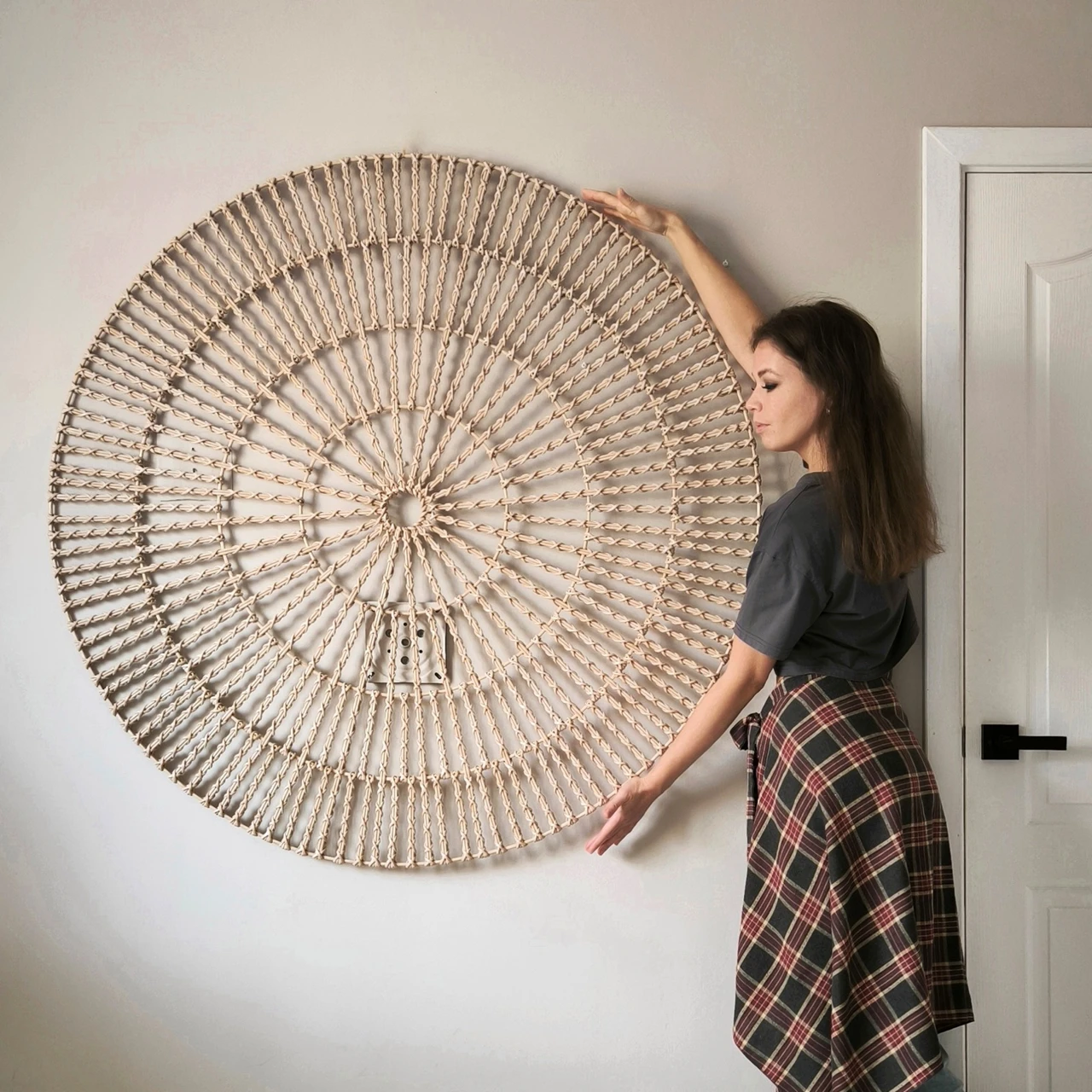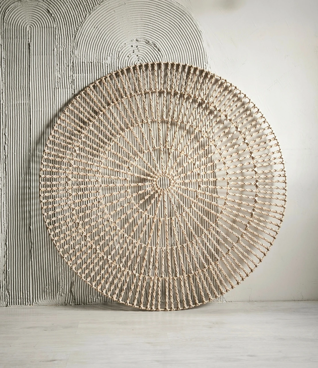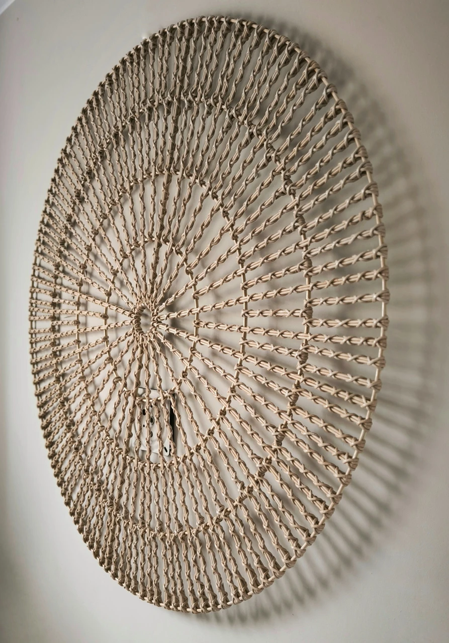 Выразительное круглое панно с ажурным плетением. Геометрический узор и легкая фактура создают эффект объема и делают его самостоятельным арт-объектом. Подойдет для современных интерьеров.