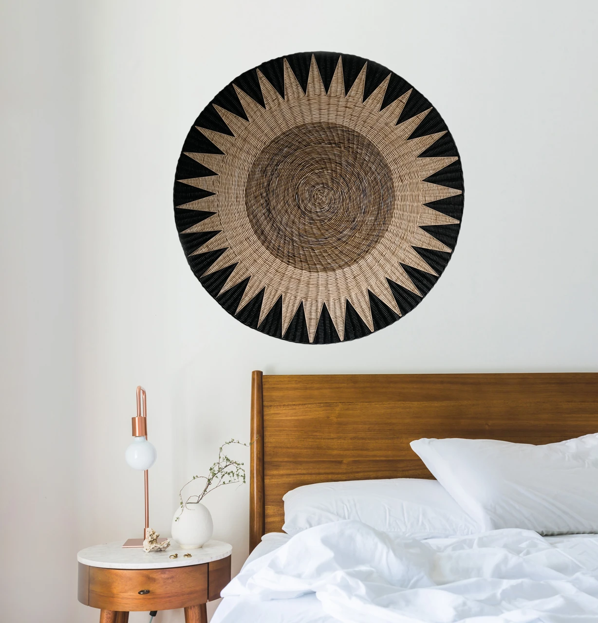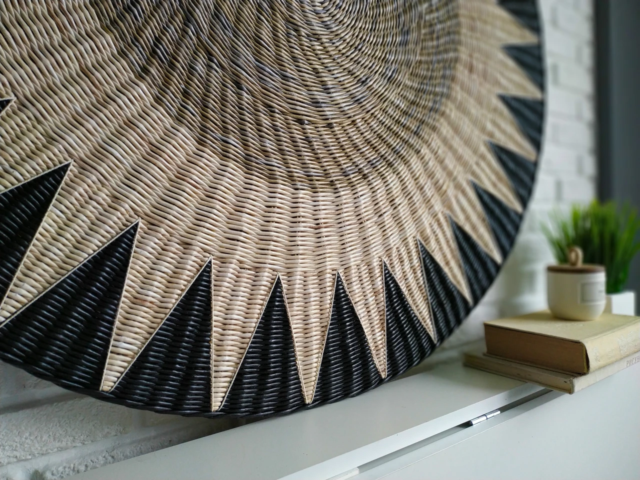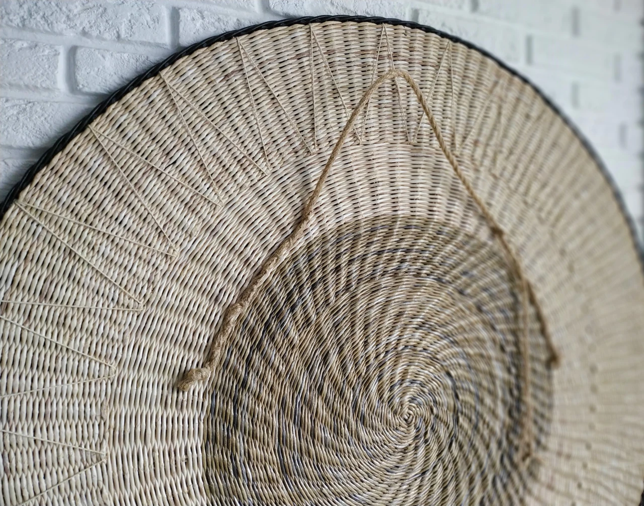 Большое фактурное плетеное панно подойдет для декорирования стен над изголовьем кровати. Круглая настенная тарелка имеет геометрический рисунок, она подходит для украшения интерьера в этно стиле.