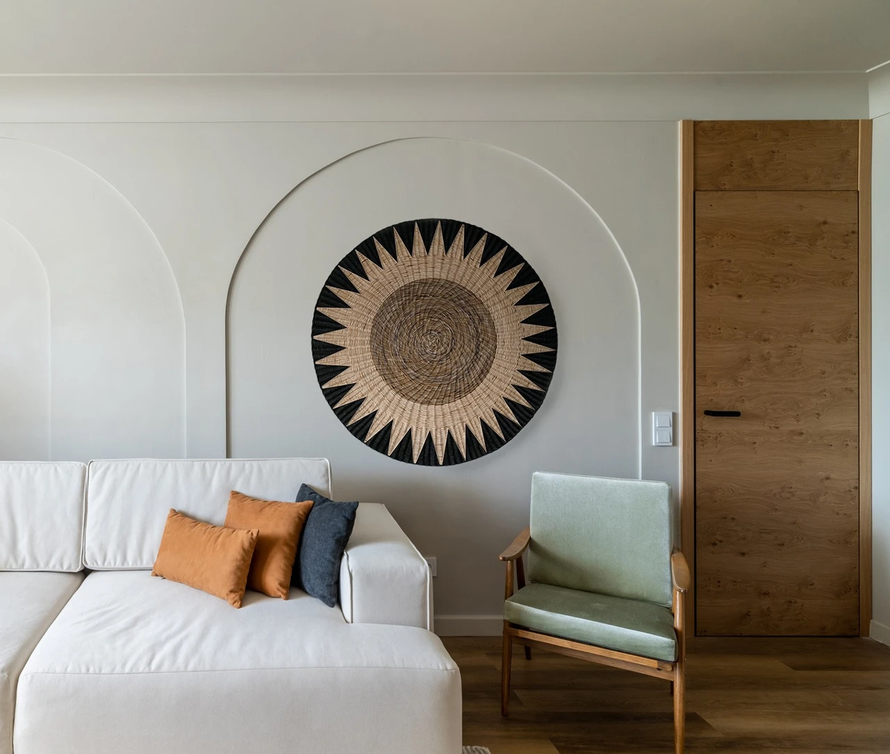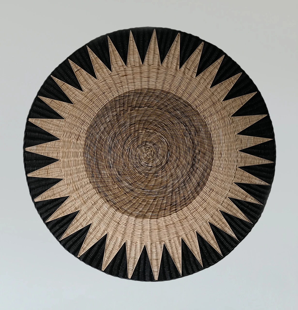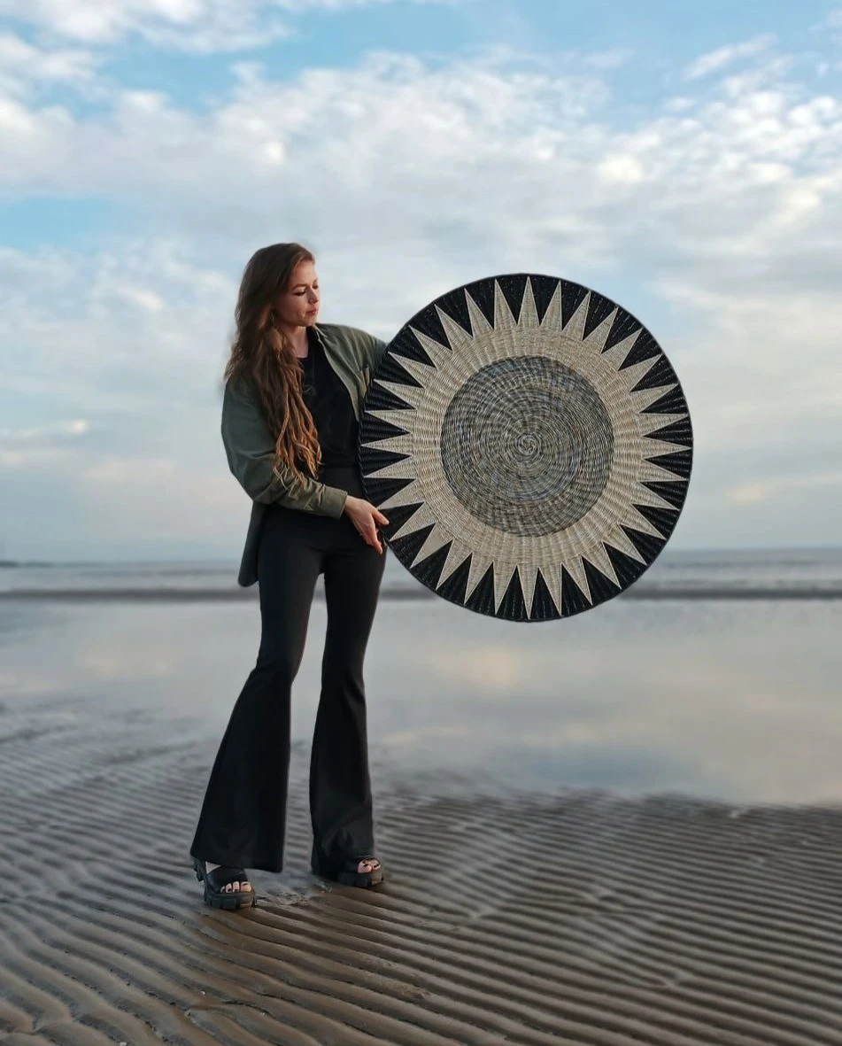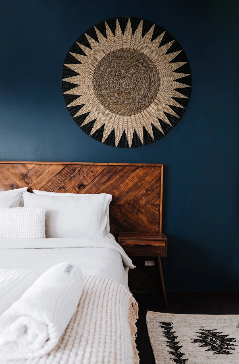 Большое фактурное плетеное панно подойдет для декорирования стен над изголовьем кровати. Круглая настенная тарелка имеет геометрический рисунок, она подходит для украшения интерьера в этно стиле.