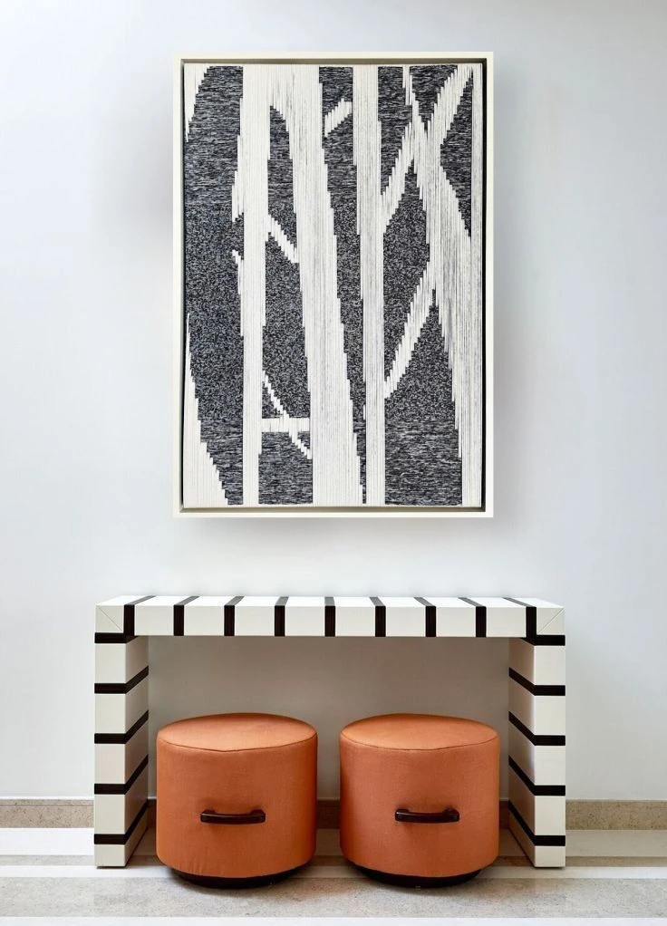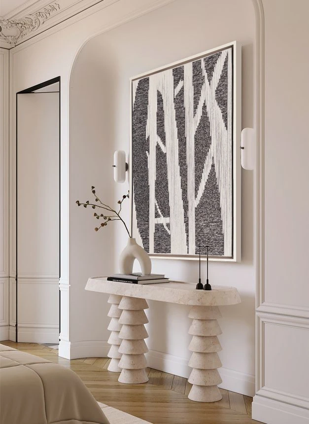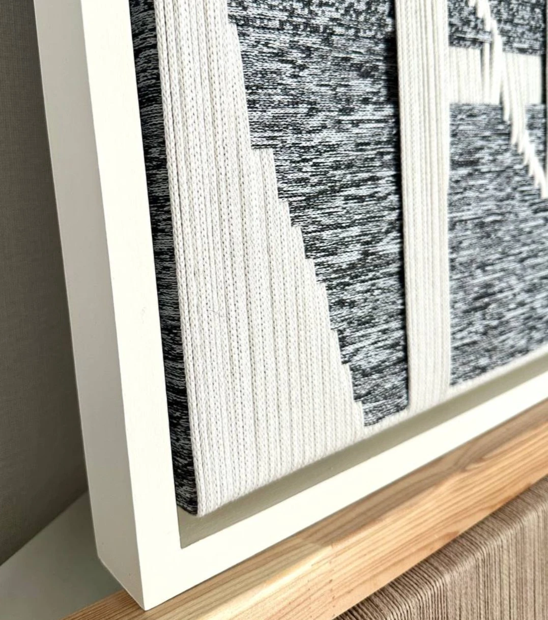 Лаконичная чёрно-белая палитра подчёркивает графичность работы, делая акцент на структуре и рельефе. Панно органично вписывается в современные интерьеры, особенно в пространства с минималистичной или архитектурной эстетикой, где ценится чистота линий и выразительность материала.
