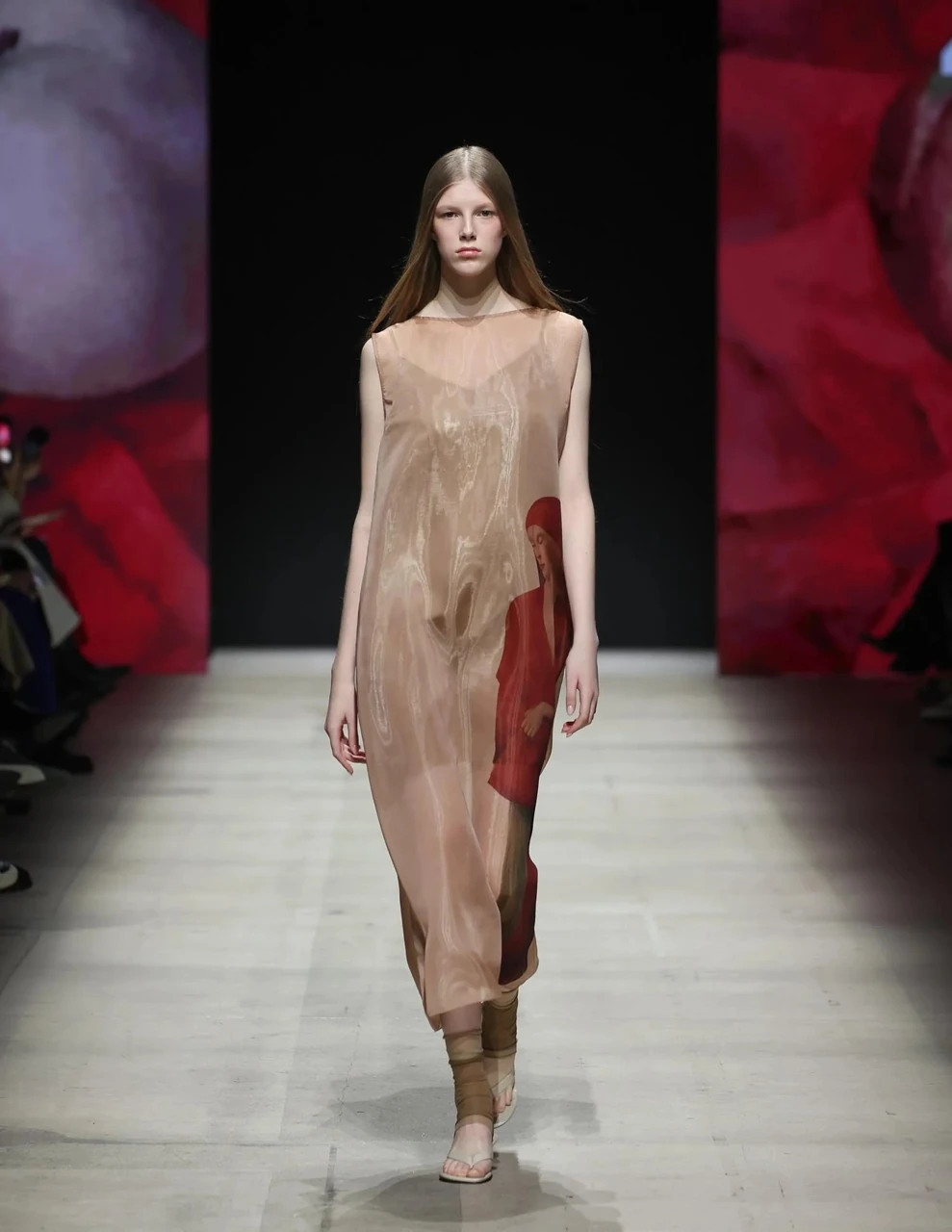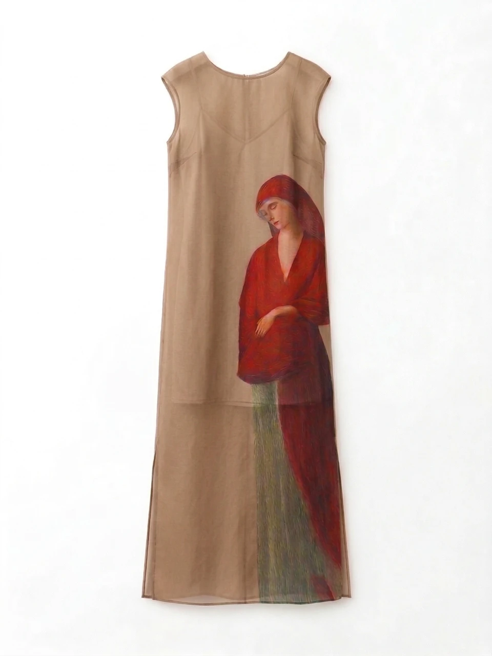Авторский принт на платье — про силу и мягкость, олицетворение женских образов, которые так часто изображал художник в своих работах. Лаконичное по форме, с ярким принтом-акцентом, с вырезом-лодочкой, без застежек, по бокам разрезы. В комплекте — нижнее платье на регулируемых бретелях.