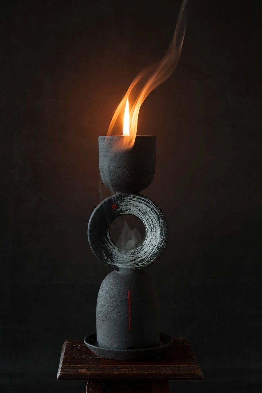 Интерьерный объект-подсвечник с функцией благовонницы. Входит в серию «Культ личного», при создании которой я вдохновляюсь различной ритуальной атрибутикой, присущей религиозным культам, и переосмысливаю её форму и содержание. На её основе я создаю предметы, используемые в обычной жизни, к которым мы обращаемся для создания у себя определенного настроения, наделяя их сакральной составляющей.