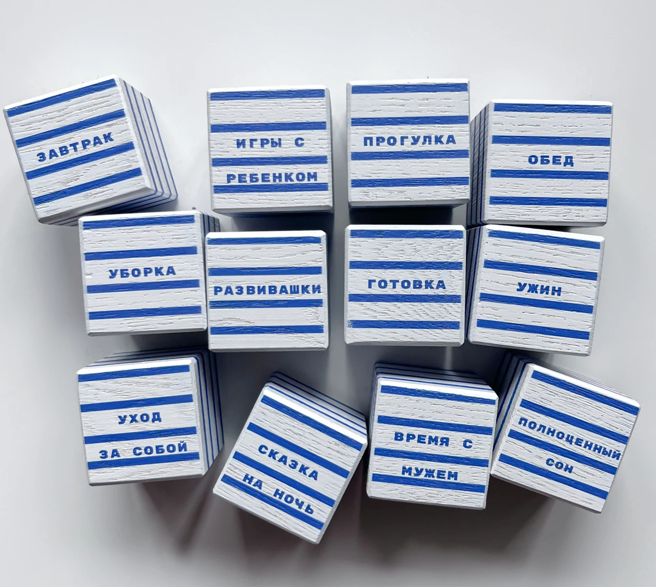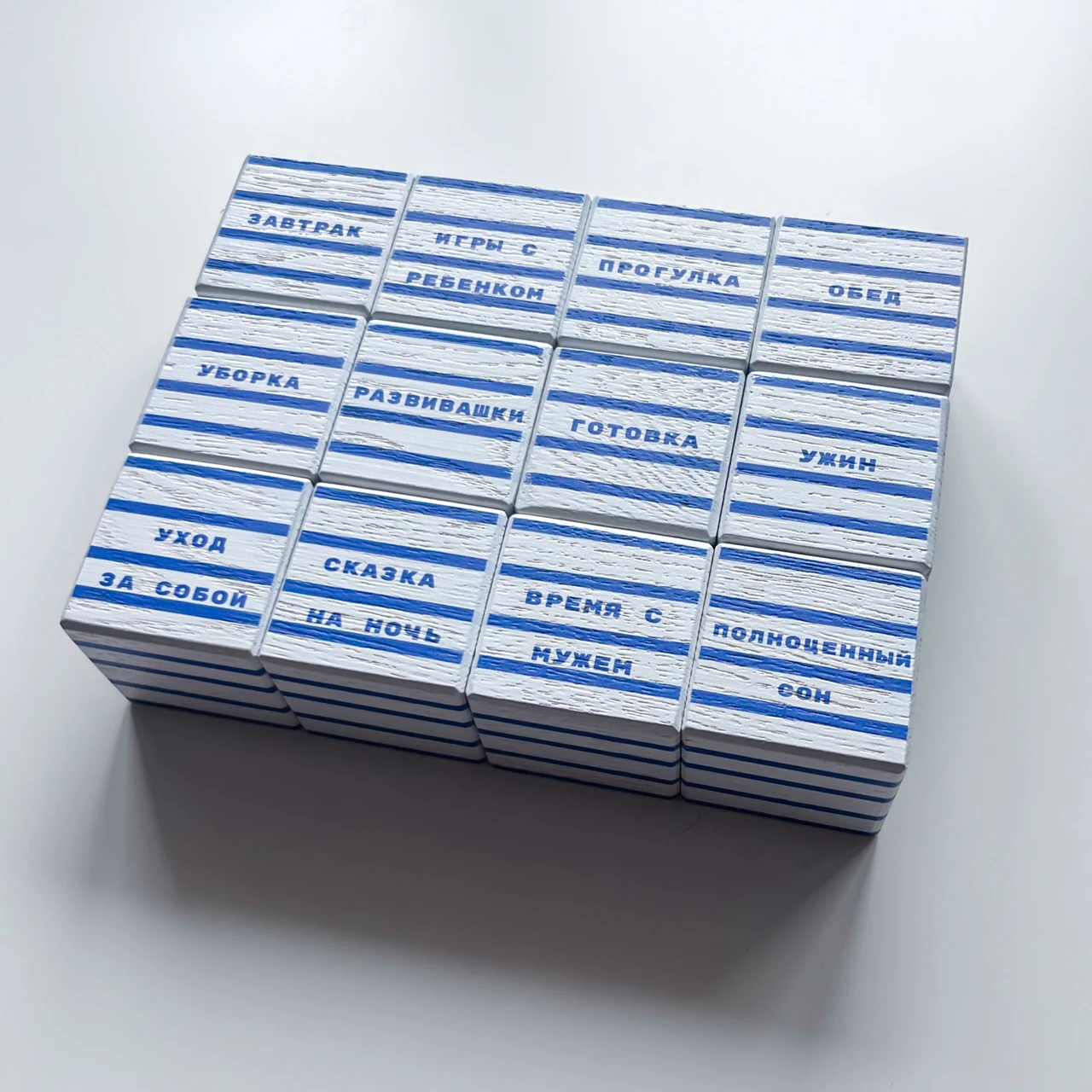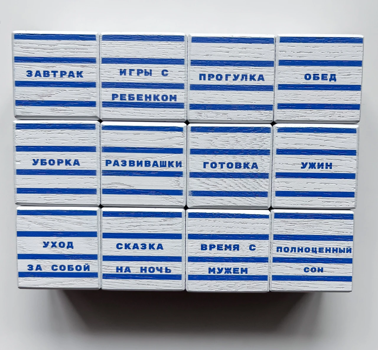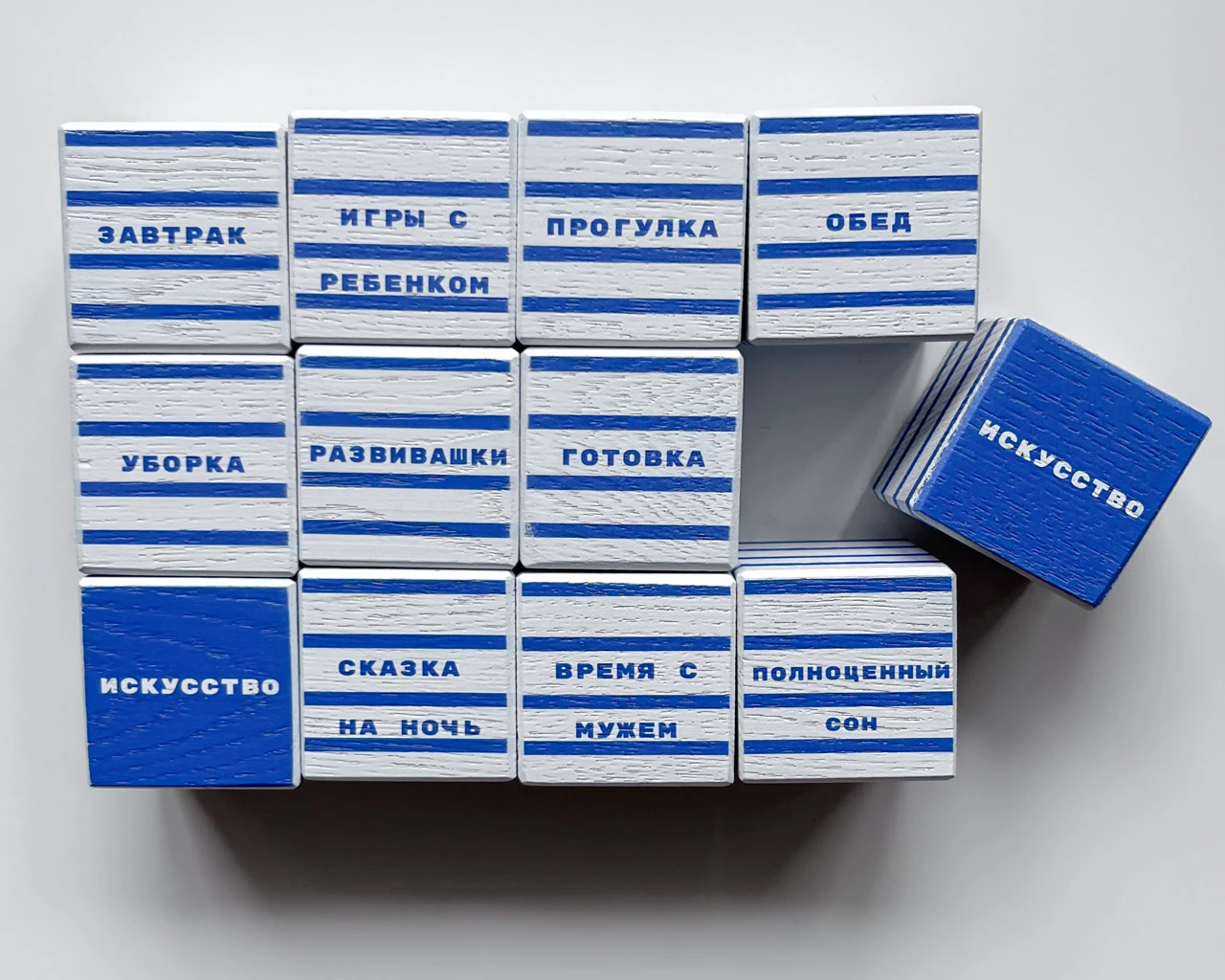 Правила игры: перед вами 12 кубиков со слотами дел, которые выполняет обычная мама находясь в декретном отпуске*. Мама хочет найти время на то, чтобы заниматься искусством. Ваша задача: решить, от каких дел откажется мама. Возьмите выбранный вами кубик, переверните его так, чтобы грань, где написано «искусство», была сверху и верните кубик на место. Количество перевернутых кубиков не ограничено. Время на ваше решение не ограничено. Можно принимать решение, посоветовавшись с кем-нибудь, особенно с мамами.