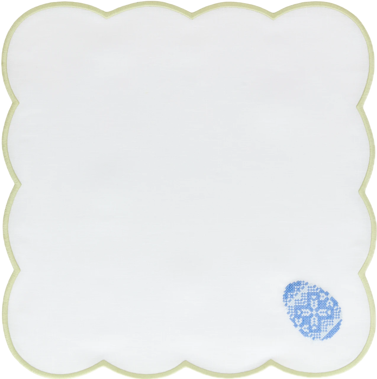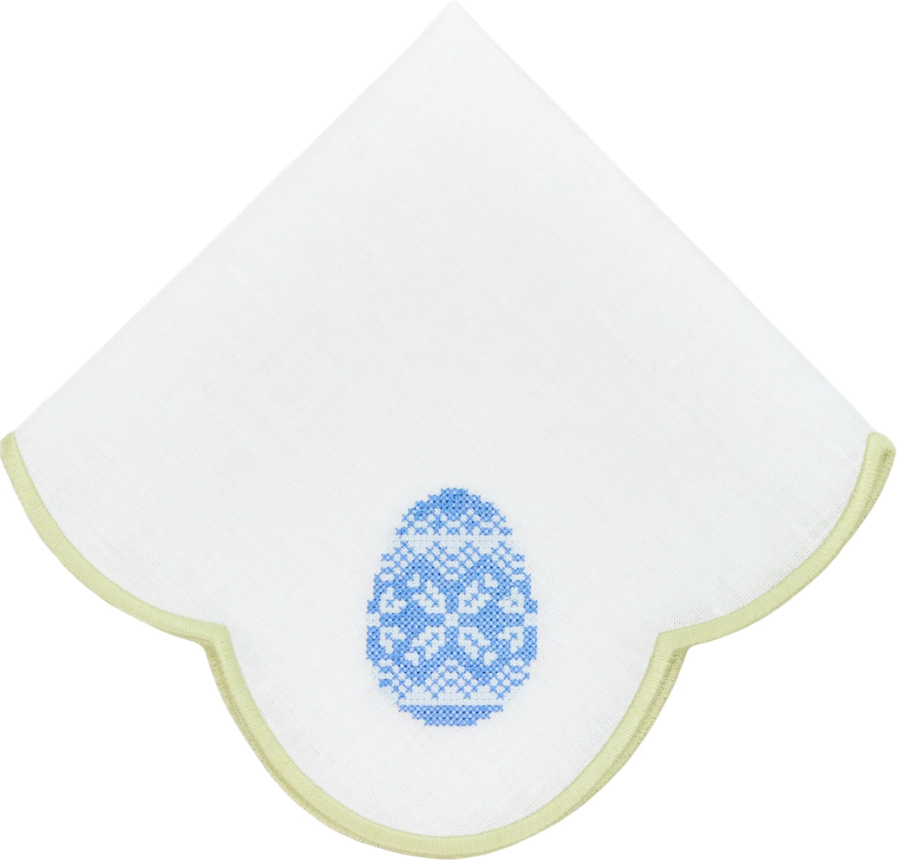 Салфетка сервировочная, 43х43, из 100% льна, с фигурной вышивкой по краю, с вышивкой голубого яйца внутри, коллекции «Пасхальная радуга» на вашем столе словно калейдоскоп весеннего настроения, сотканный из нежных оттенков. От лимонно-желтого, напоминающего о первом солнце, до небесно-голубого, как символ чистого неба.