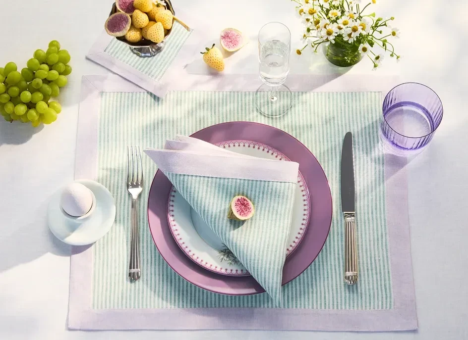 Салфетка подстановочная из 100% белого льна в зеленую полоску с пришивным лиловым кантом. Коллекция Countryside создана для сервировки стола вашего загородного дома. Классический дизайн в виде полос идеально подойдет для любого случая, сочетая практичность и французский стиль.