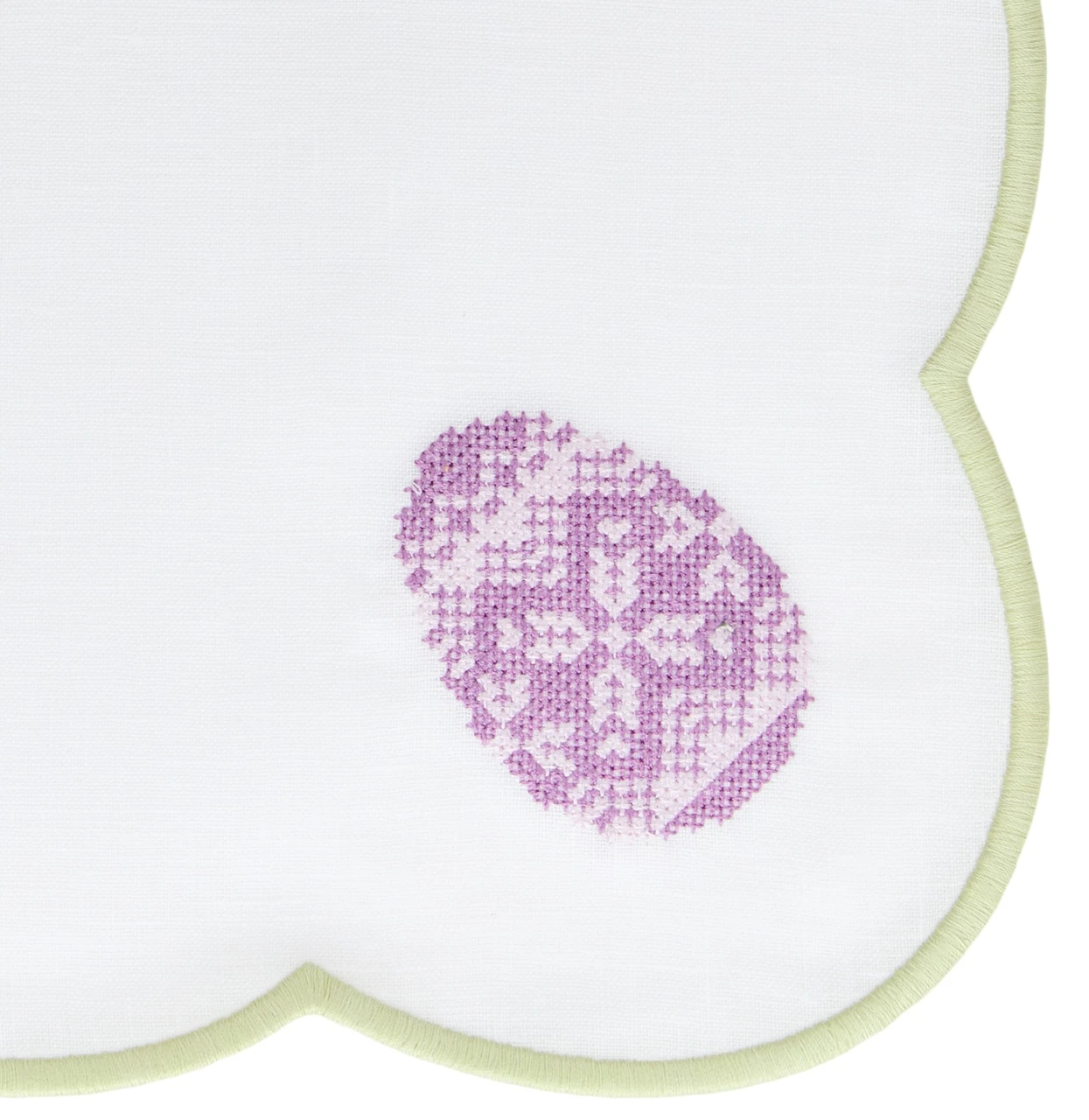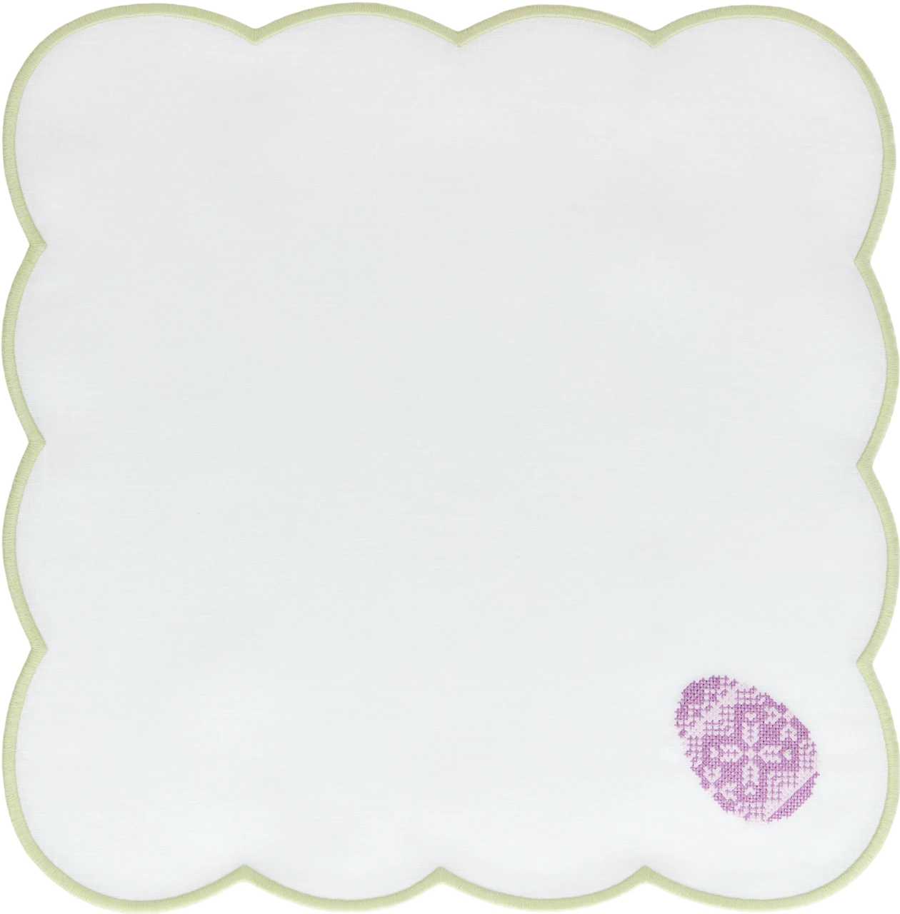 Салфетка сервировочная, 43х43, из 100% льна, с фигурной вышивкой по краю, с вышивкой нежно-фиолетового яйца внутри, коллекции «Пасхальная радуга» на вашем столе словно калейдоскоп весеннего настроения, сотканный из нежных оттенков. От лимонно-желтого, напоминающего о первом солнце, до небесно-голубого, как символ чистого неба.