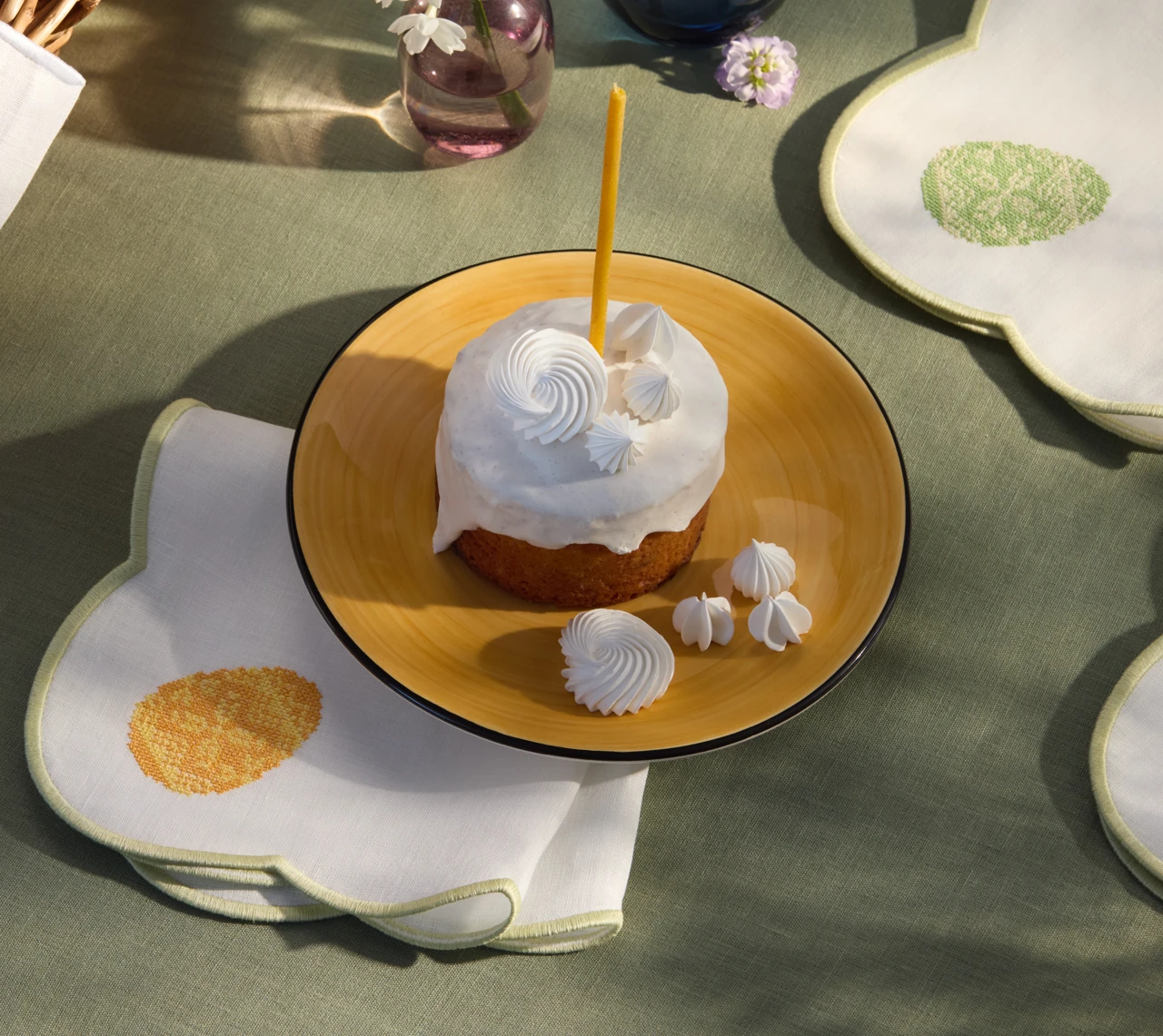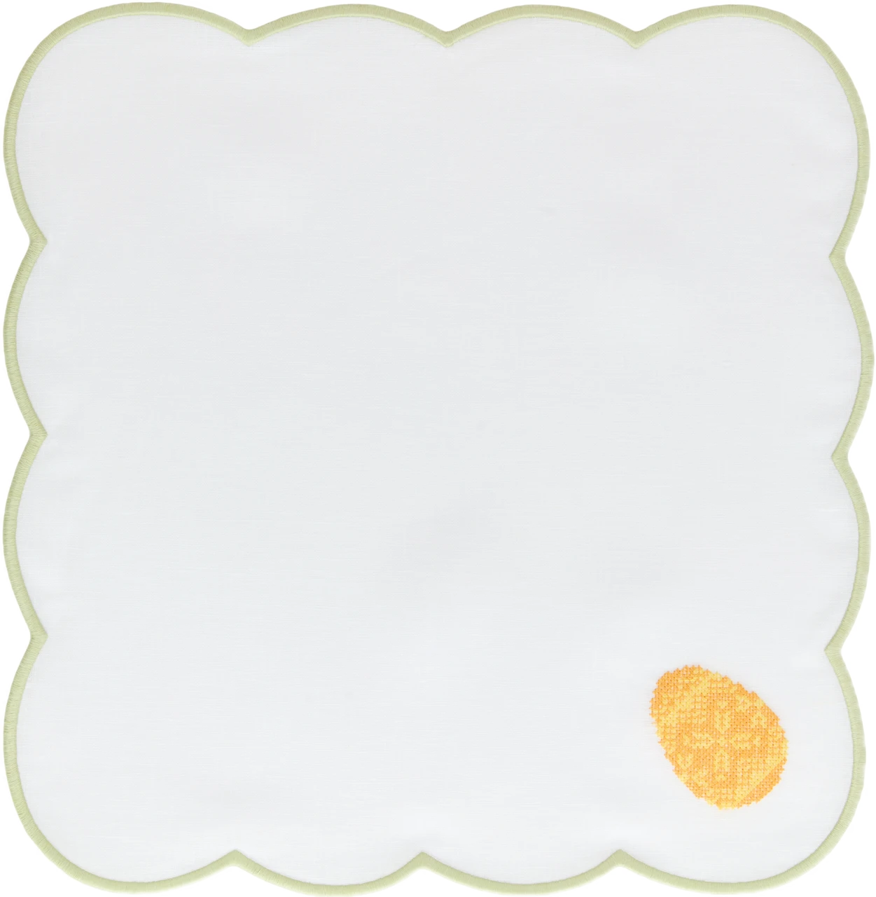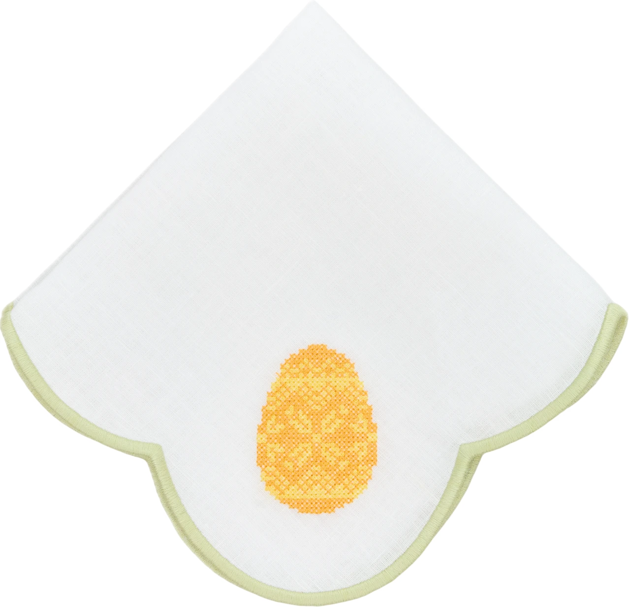 Салфетка сервировочная, 43х43, из 100% льна, с фигурной вышивкой по краю, с вышивкой желтого яйца внутри, коллекции «Пасхальная радуга» на вашем столе словно калейдоскоп весеннего настроения, сотканный из нежных оттенков. От лимонно-желтого, напоминающего о первом солнце, до небесно-голубого, как символ чистого неба.
