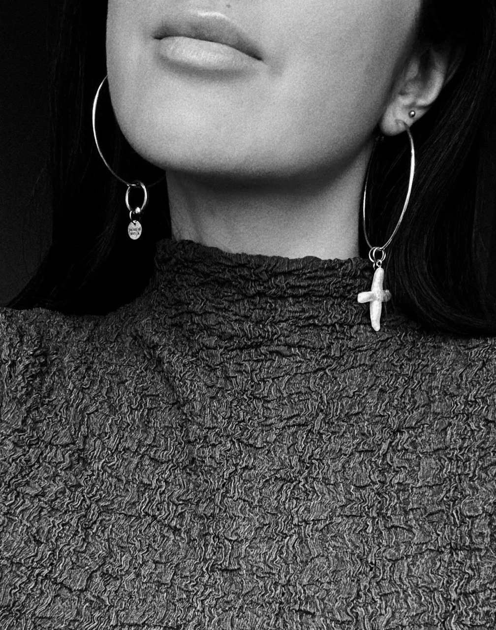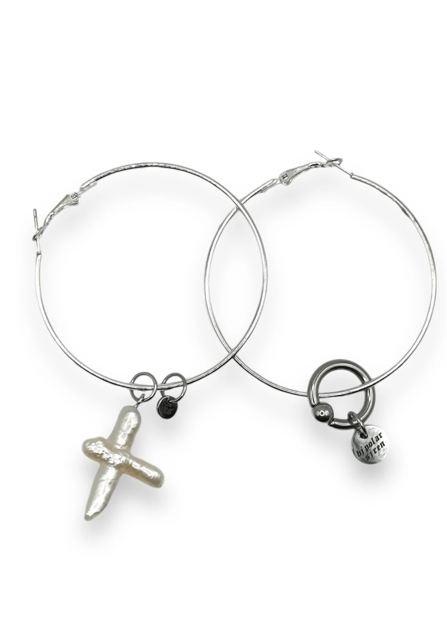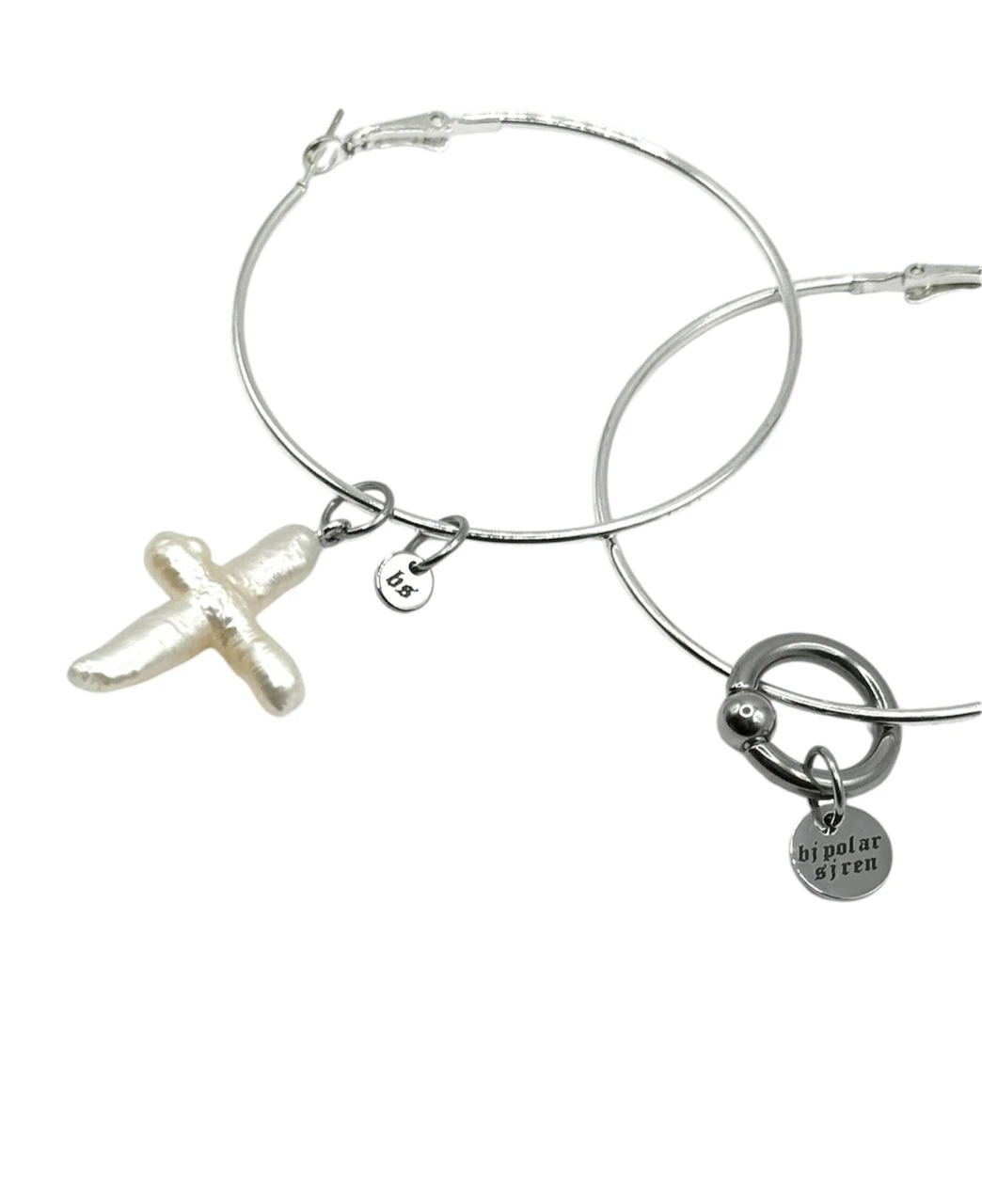 Пара серёг-колец с подвесками из барочной жемчужины в форме креста и пирсинга. Диаметр колец — 6см.