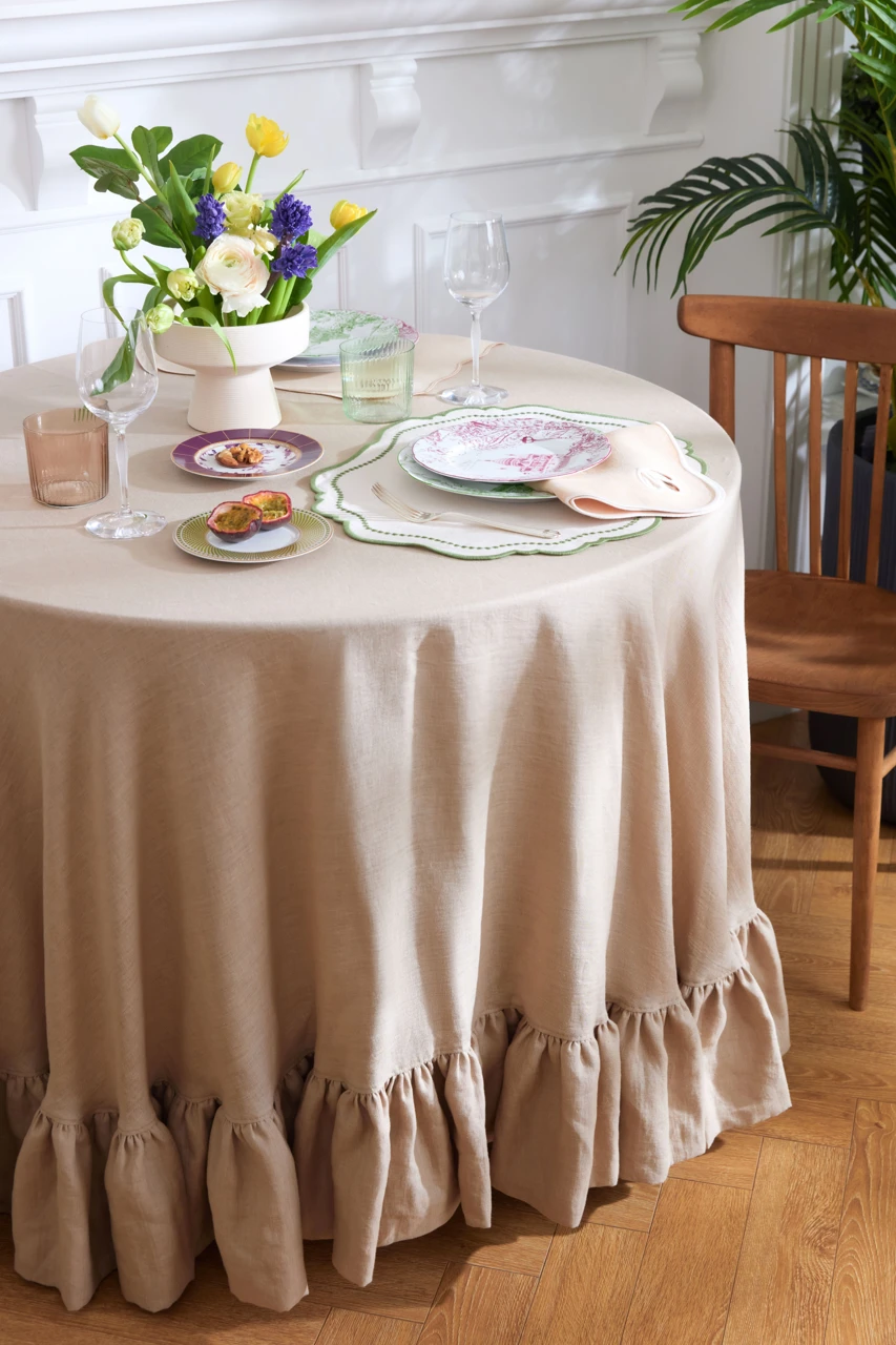 Круглая скатерть D150, из 100% бежевого льна с пришивным воланом коллекции Brigitte Bardot — это калейдоскоп красок и фактур, напоминающий о теплых морских бризах, ласковом солнце и беззаботных днях, проведенных на пляжах Сен-Тропе. Нежные пастельные оттенки небесно-голубого, песочного и лавандового создают атмосферу умиротворения и спокойствия. Яркие акценты кораллового, терракотового и охры добавляют нотку игривости и страсти.
